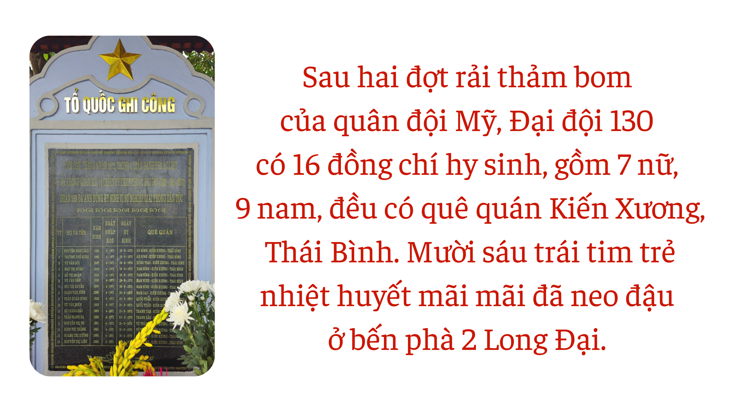 Nỗi đau chưa kịp nguôi ngoai, chỉ bốn ngày sau, máy bay quân đội Mỹ lại tiếp tục ném bom xuống bến phà 2 Long Đại, khiến chiến sĩ Trần Mạnh Hà hy sinh. Đại đội 130 một lần nữa lại phải tiễn đưa người đồng chí của mình trong nỗi đau thương lên đến tột cùng. Sau hai đợt rải thảm bom của quân đội Mỹ, Đại đội 130 có 16 đồng chí hy sinh, gồm 7 nữ, 9 nam, đều có quê quán Kiến Xương, Thái Bình. Mười sáu trái tim trẻ nhiệt huyết mãi mãi đã neo đậu ở bến phà 2 Long Đại. Mười sáu trái tim là mười sáu cuộc đời của các chàng trai, cô gái còn rất trẻ. Cái quý nhất của mỗi con người là sinh mạng thì các anh chị đã hiến dâng cho Tổ quốc. Còn sự hy sinh nào lớn hơn thế, khi mất đi mà một phần thân xác có người vẫn chưa về.