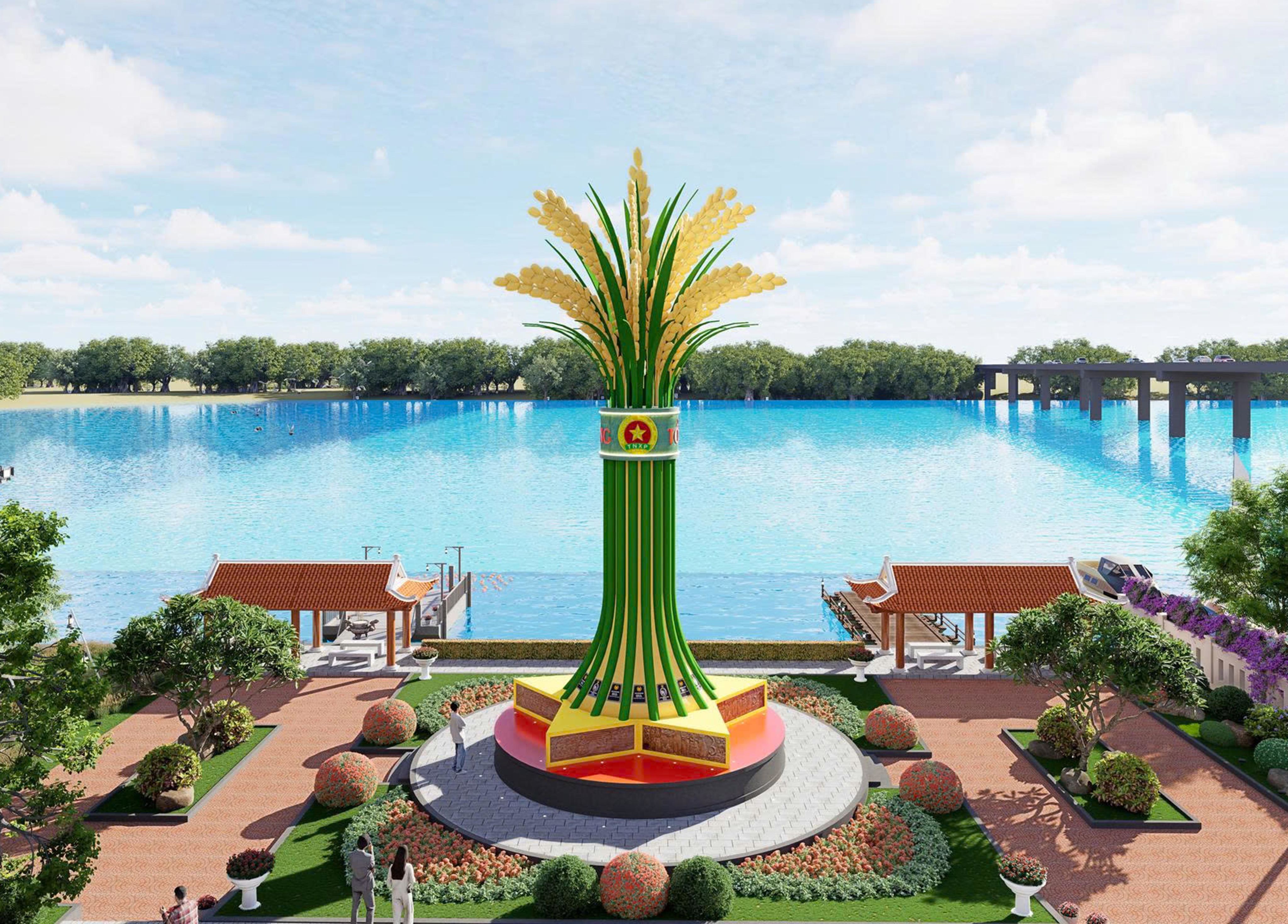 Tượng đài mang hình 16 bông lúa nhìn ra hướng sông Long Đại là điểm nhấn ấn tượng của di tích.