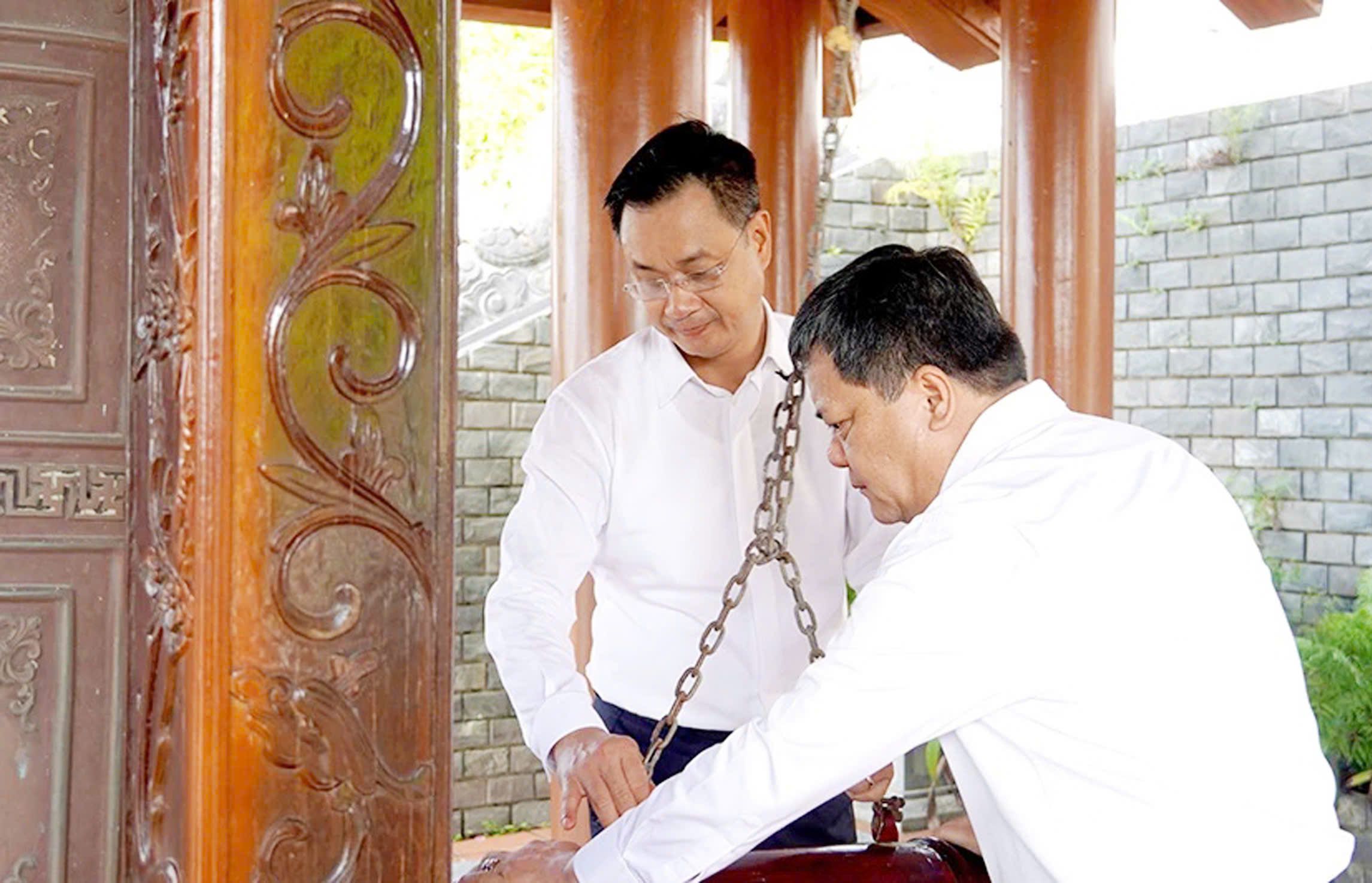 Bí thư Tỉnh ủy Quảng Trị Lê Ngọc Quang và Chủ tịch Ủy ban nhân dân tỉnh Trần Phong thỉnh chuông tại Đền tưởng niệm Liệt sĩ Trường Sơn ở Bến phà Long Đại.