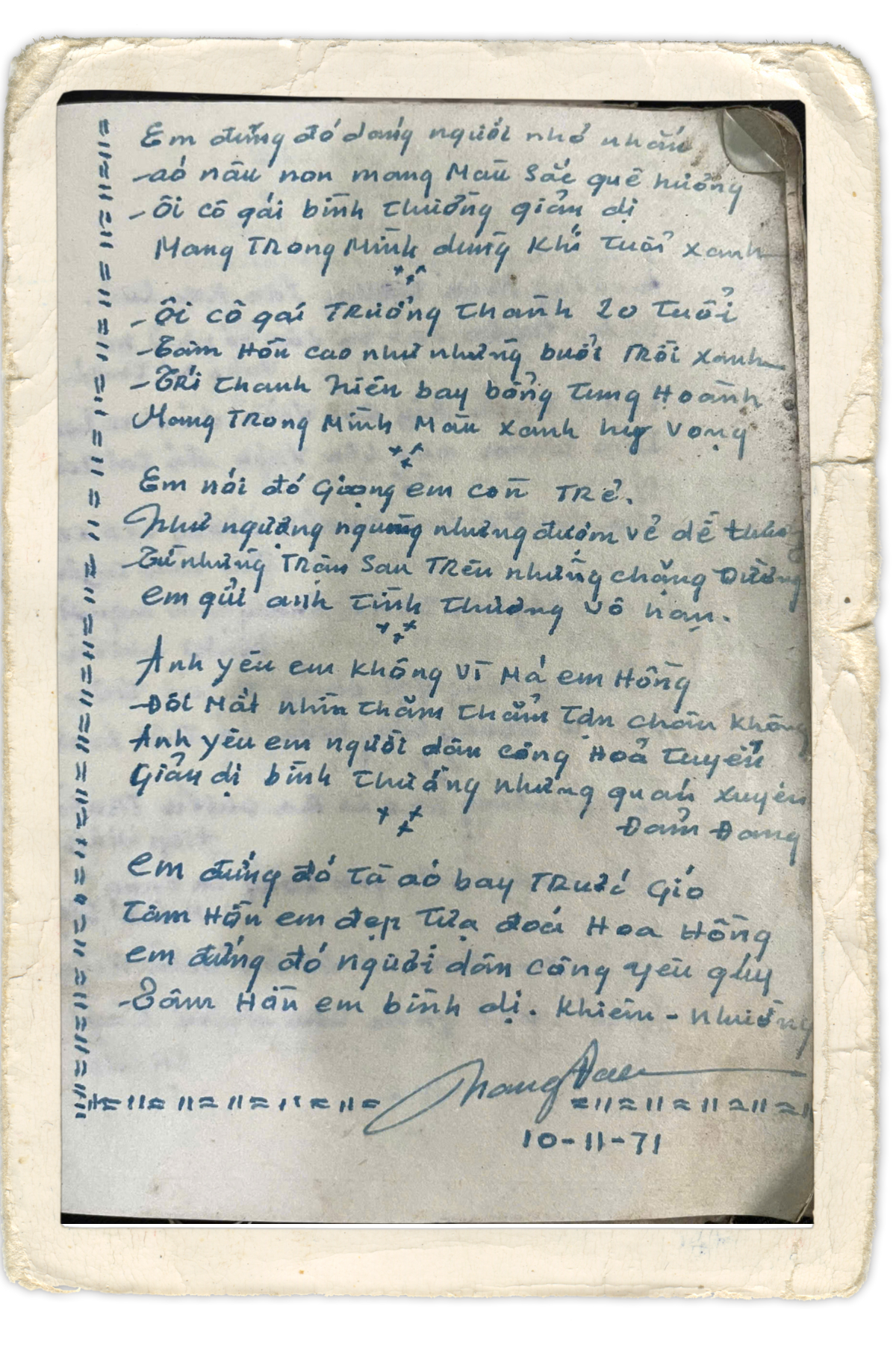 Rồi giữa chiến trường bom đạn mịt mù, bất chợt gặp người con gái đồng hương, xinh đẹp cùng ra trận, những dòng tâm sự bằng thơ của anh lại bay bổng, ngọt ngào, tình yêu của họ lúc này không chỉ là cảm xúc cá nhân mà hòa quyện với lý tưởng chung của dân tộc : “Lên Trường Sơn xẻ núi mở đường. Gặp em con gái quê hương. Tóc xanh phảng phất mùi hương ruộng đồng. Ôi đôi má em hồng lên vì nắng. Đôi mắt nhìn như xuyên thẳng vào tim. Ôi nụ cười tô thắm tình duyên. Của cô gái đồng chiêm mười tấn.”( Ngày 10/11/1971).