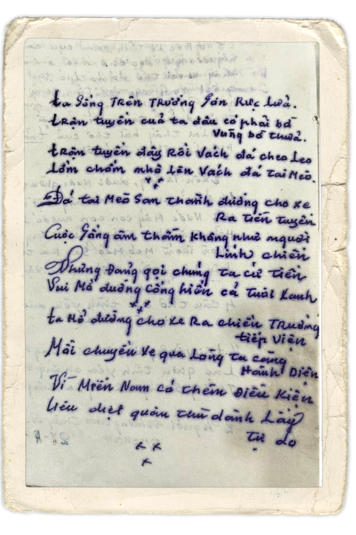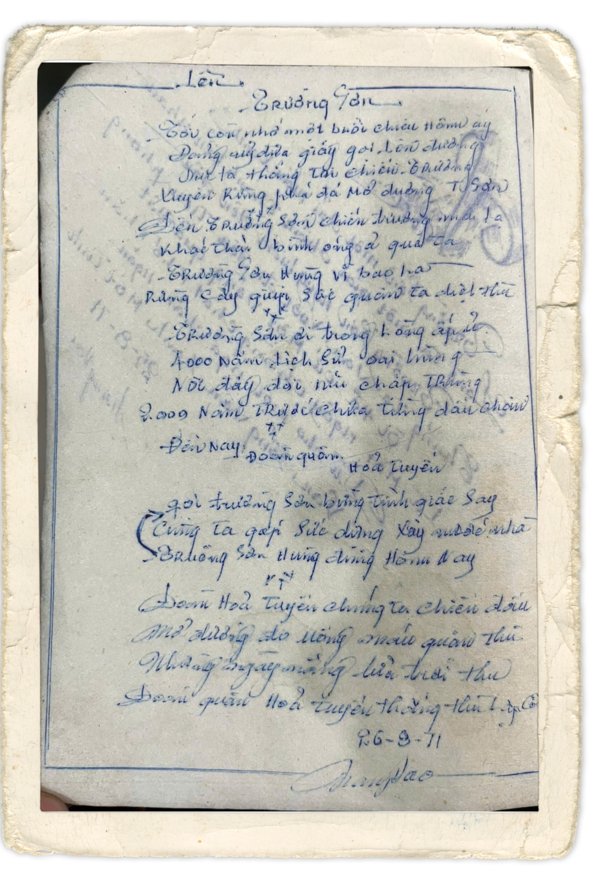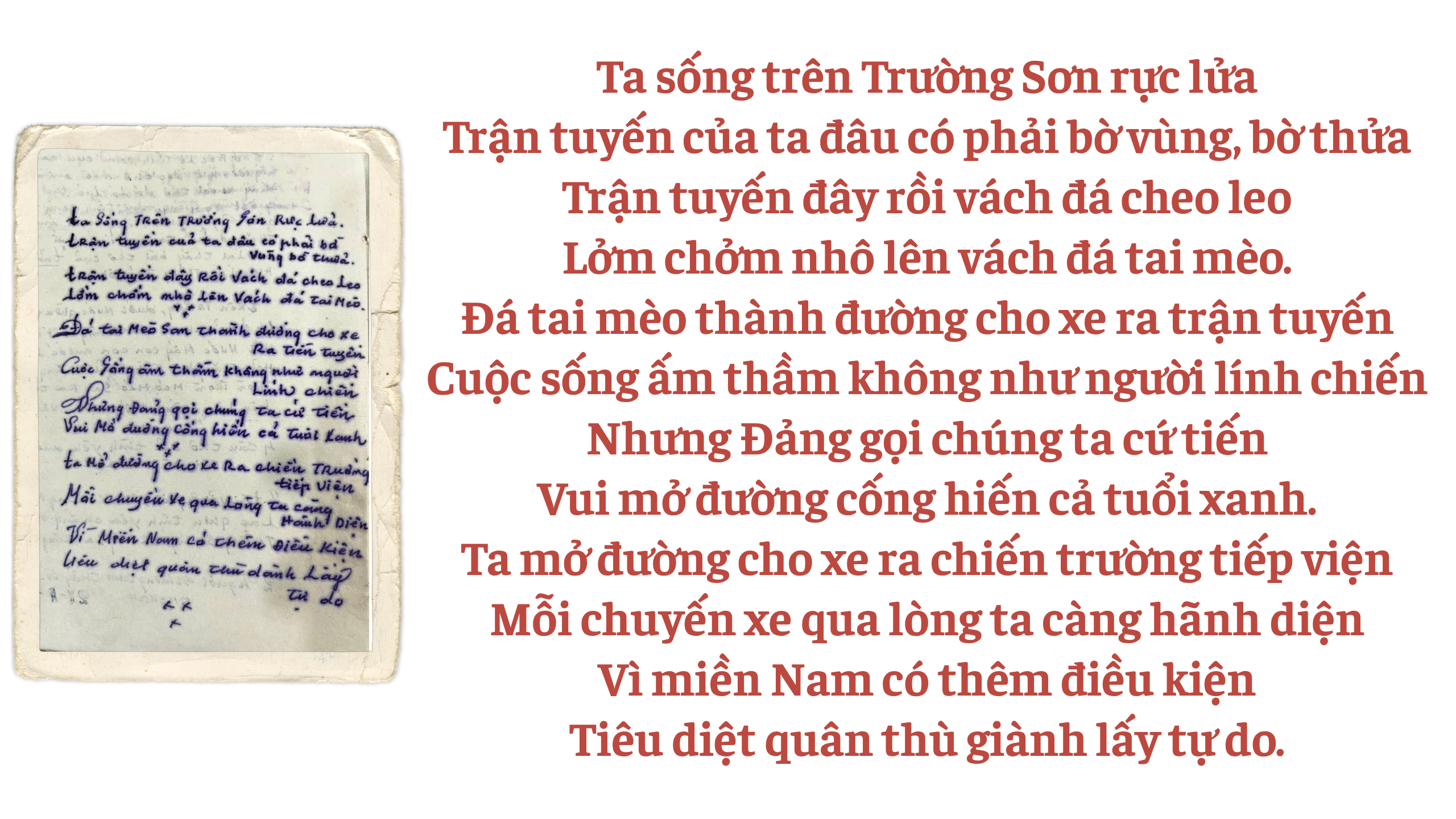 Trong bài “Lên Trường Sơn” tác giả viết: “Đoàn hỏa tuyến chúng ta chiến đấu. Mở đường đi uống máu quân thù. Những ngày nắng lửa trời thu. Đoàn quân hỏa tuyến thắng thù lập công”( 26/8/1971).