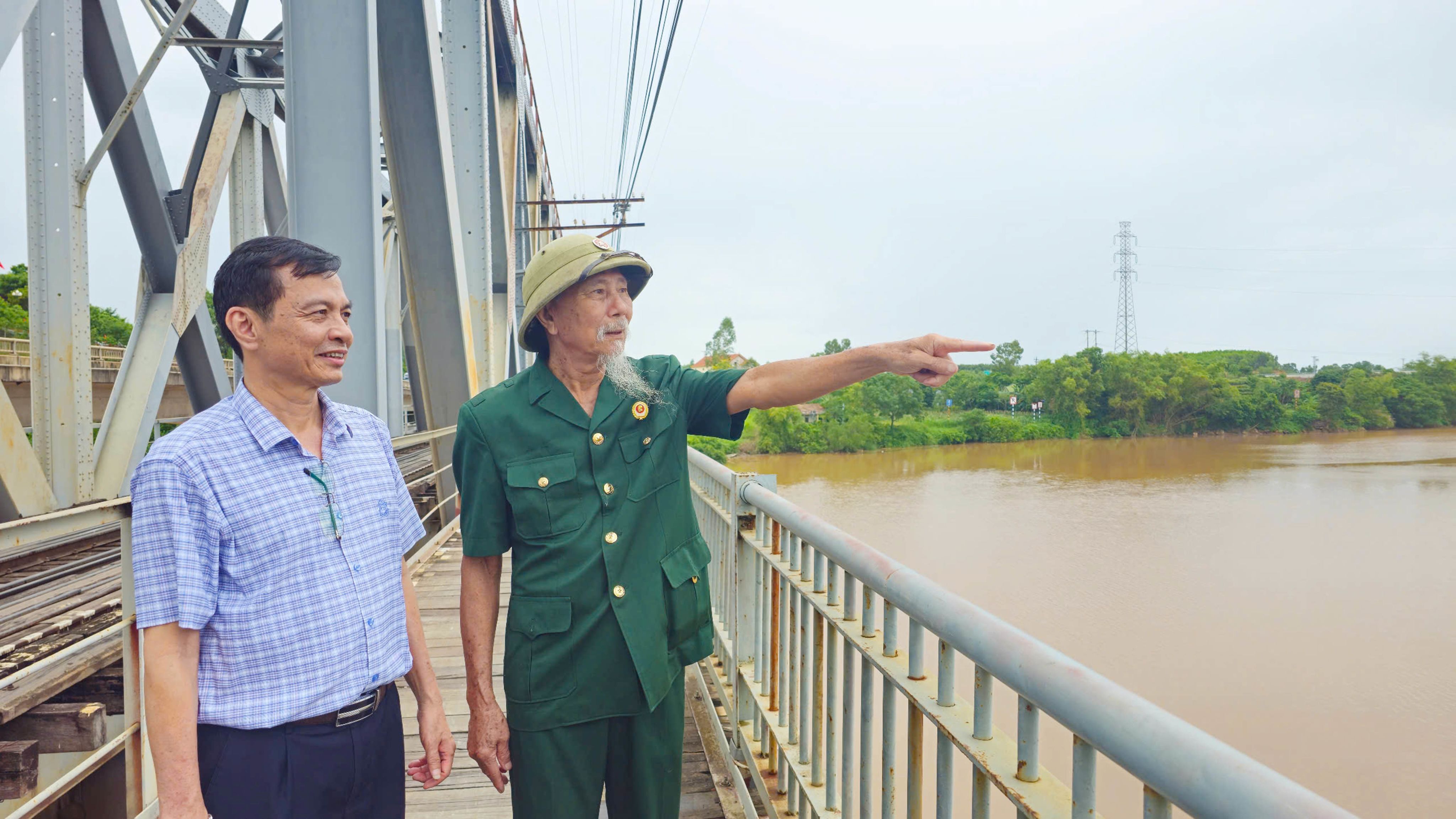 Cựu chiến binh Nguyễn Văn Phúng và tác giả tại cầu đường sắt Long Đại.