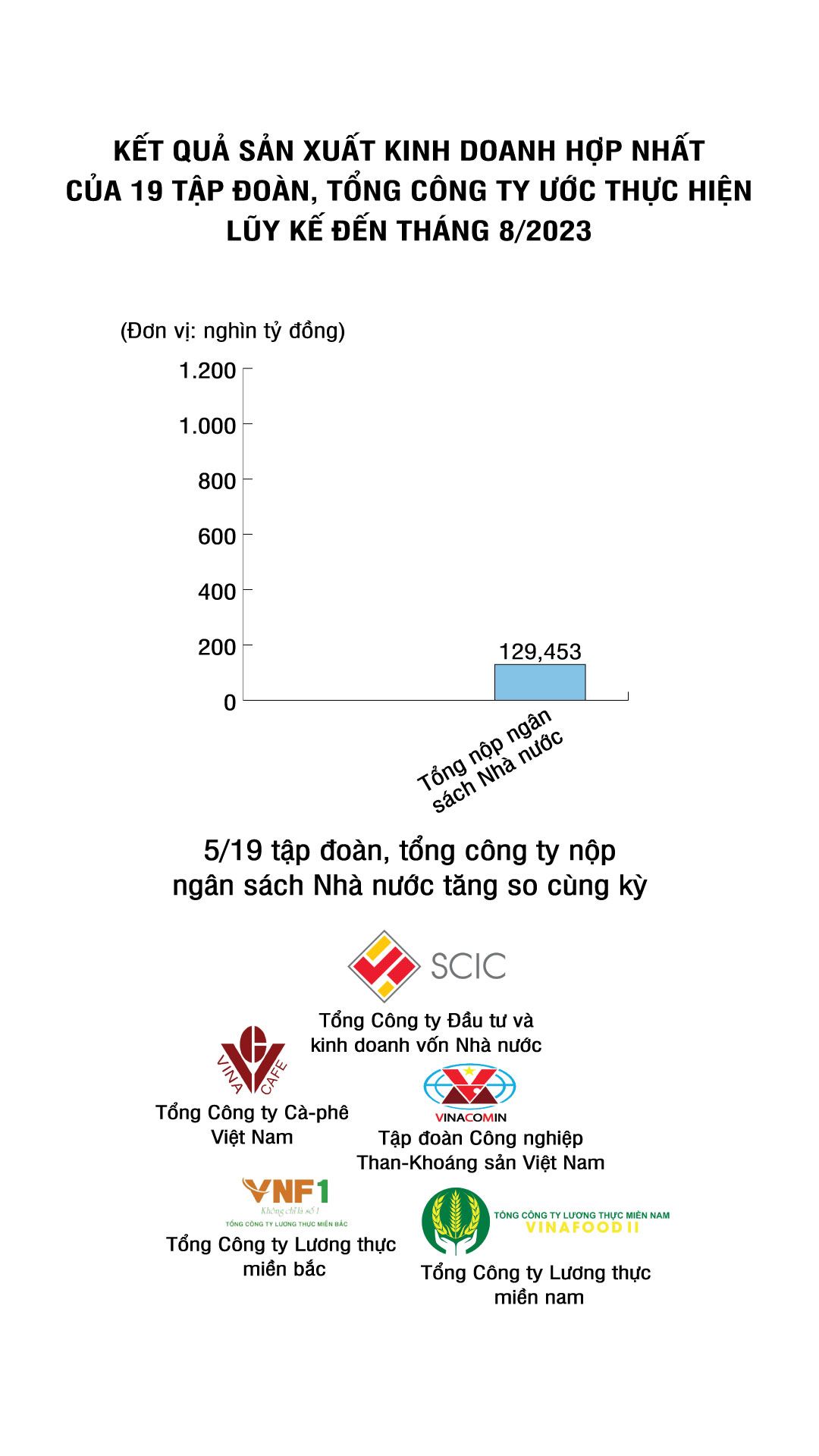 Tổng nộp ngân sách nhà nước đạt 129.453 tỷ đồng, bằng 85% kế hoạch năm và 102% so với cùng kỳ. Trong đó có 5/19 tập đoàn, tổng công ty nộp ngân sách nhà nước tăng so với cùng kỳ gồm SCIC, TKV, Vinafood 2, Tổng công ty Lương thực miền Bắc (Vinafood 1), Tổng công ty Cà phê Việt Nam (Vinacafe).