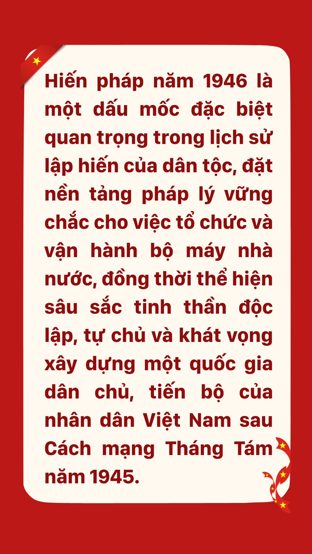 Bản Hiến pháp năm 1946 gồm 7 chương, 70 điều, quy định rõ ràng về chính thể dân chủ cộng hòa, tổ chức bộ máy nhà nước và các quyền cơ bản của công dân. Các quyền tự do cơ bản như: tự do ngôn luận, tự do báo chí, tự do tín ngưỡng, quyền bầu cử và ứng cử, quyền bình đẳng giữa nam và nữ… đều được bảo đảm và ghi nhận một cách rõ ràng, minh bạch. Đây cũng là bước phát triển vượt bậc về thể chế dân chủ ở Việt Nam, là minh chứng sinh động cho tư tưởng “lấy dân làm gốc”, đồng thời thể hiện bản lĩnh chính trị, trí tuệ và tầm nhìn chiến lược trong đường lối xây dựng Nhà nước của Chủ tịch Hồ Chí Minh và Đảng ta.
