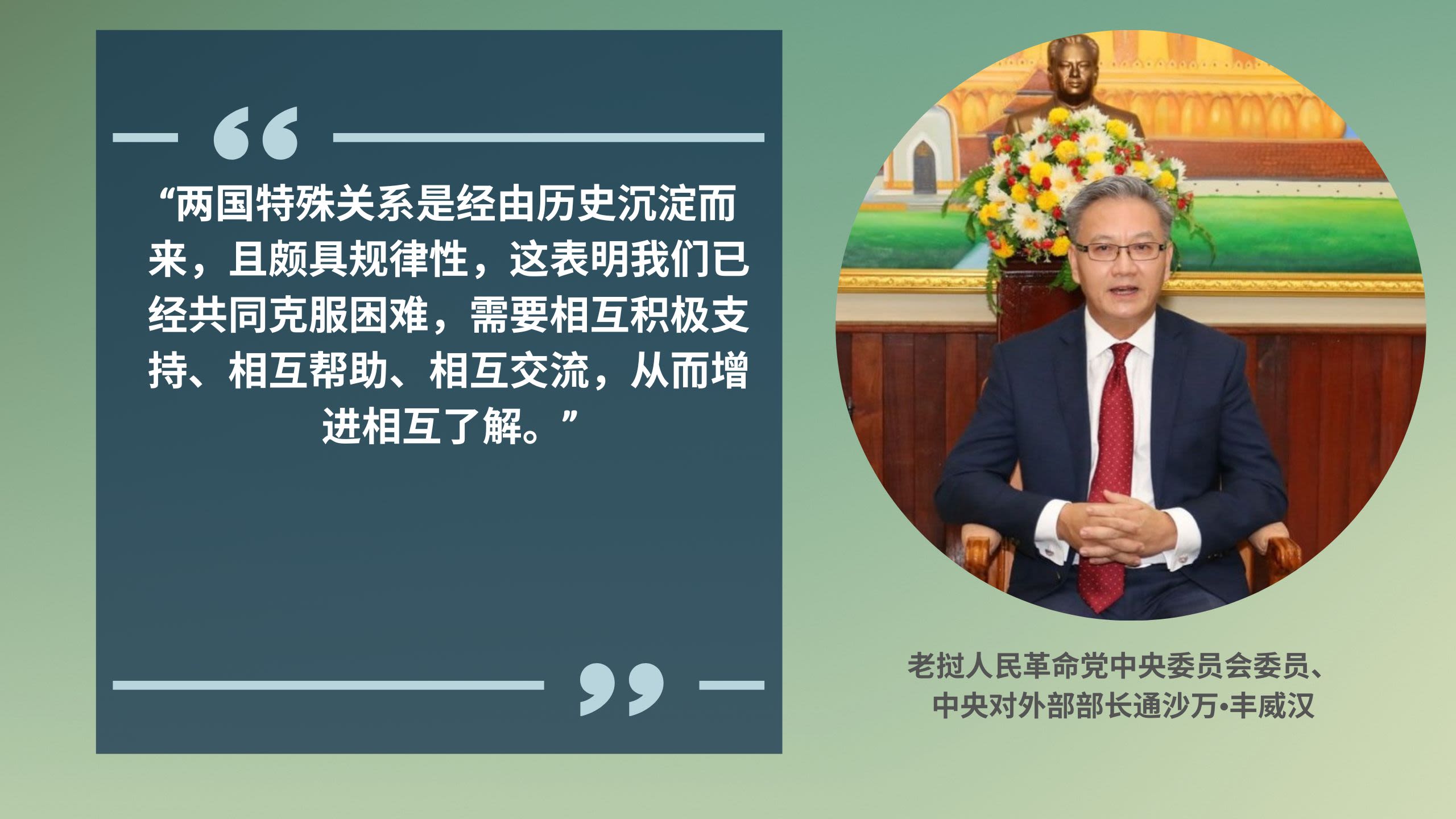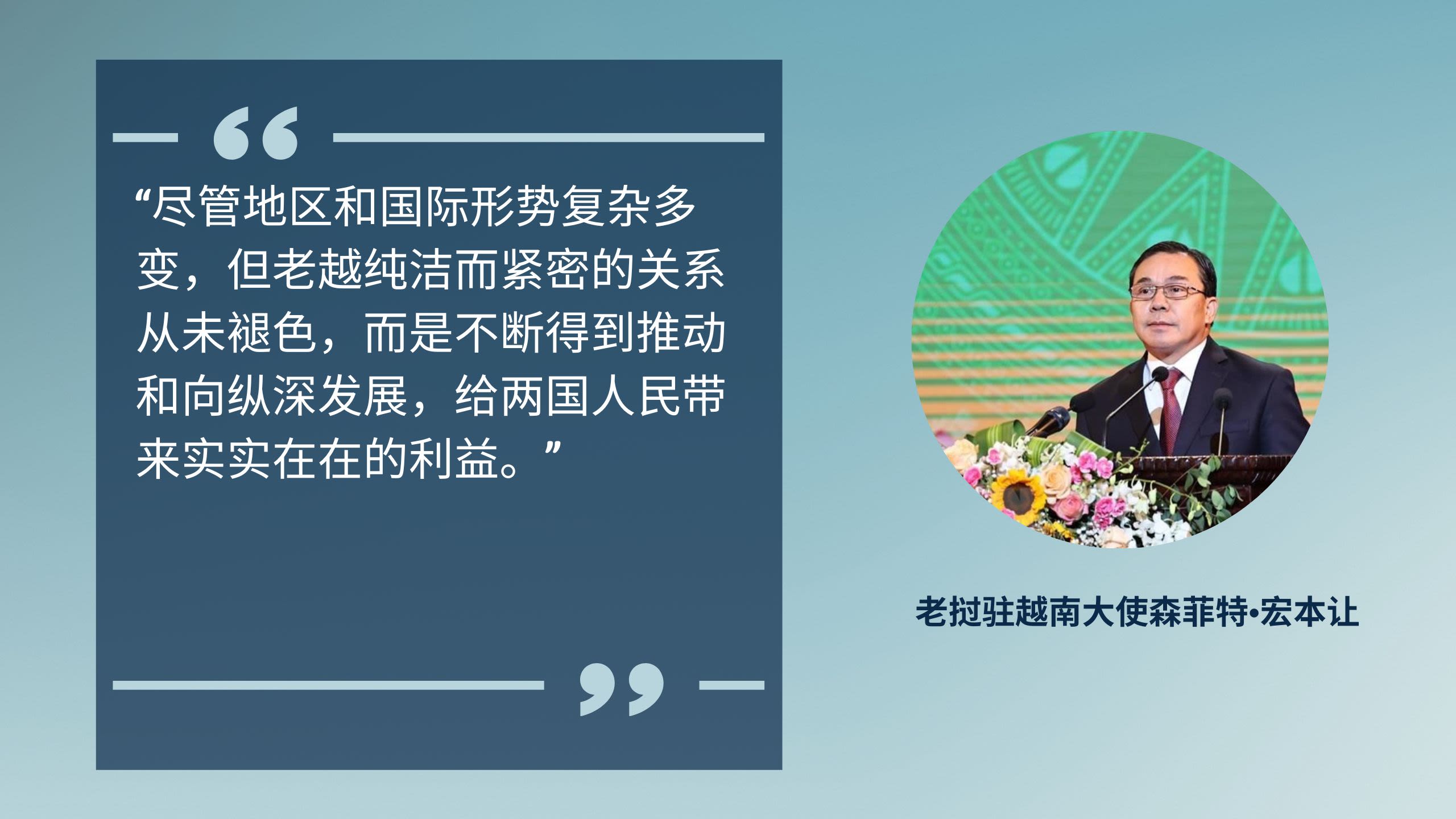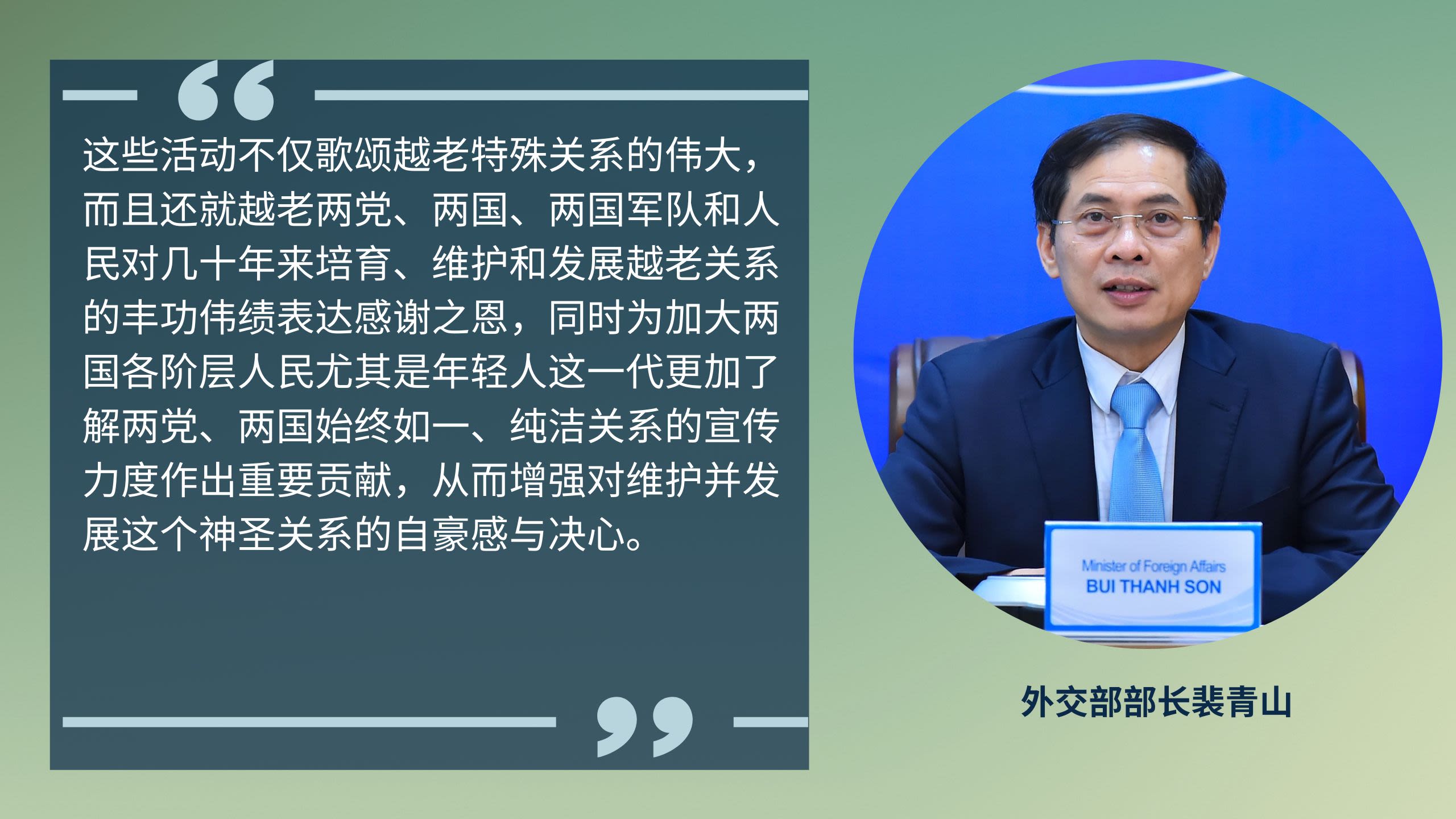越南和老挝是两个山水相连、共饮湄公河之水、共靠长山山脉的邻国。越老两国人民有着悠久、始终如一和紧密的传统关系。自印度支那共产党,后来是越南共产党和老挝人民革命党的诞生和领导以来,该关系不断扩大与发展。得益于胡志明主席和凯山·丰威汉主席、苏发努冯主席的亲手缔造,以及两国历届领导和人民的精心培育,越老特殊关系已成为两个民族的无价之宝。