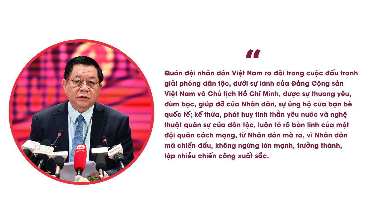 Quân đội nhân dân Việt Nam ra đời trong cuộc đấu tranh giải phóng dân tộc, dưới sự lãnh của Đảng Cộng sản Việt Nam và Chủ tịch Hồ Chí Minh, được sự thương yêu, đùm bọc, giúp đỡ của Nhân dân, sự ủng hộ của bạn bè quốc tế; kế thừa, phát huy tinh thần yêu nước và nghệ thuật quân sự của dân tộc, luôn tỏ rõ bản lĩnh của một đội quân cách mạng, từ Nhân dân mà ra, vì Nhân dân mà chiến đấu, không ngừng lớn mạnh, trưởng thành, lập nhiều chiến công xuất sắc.