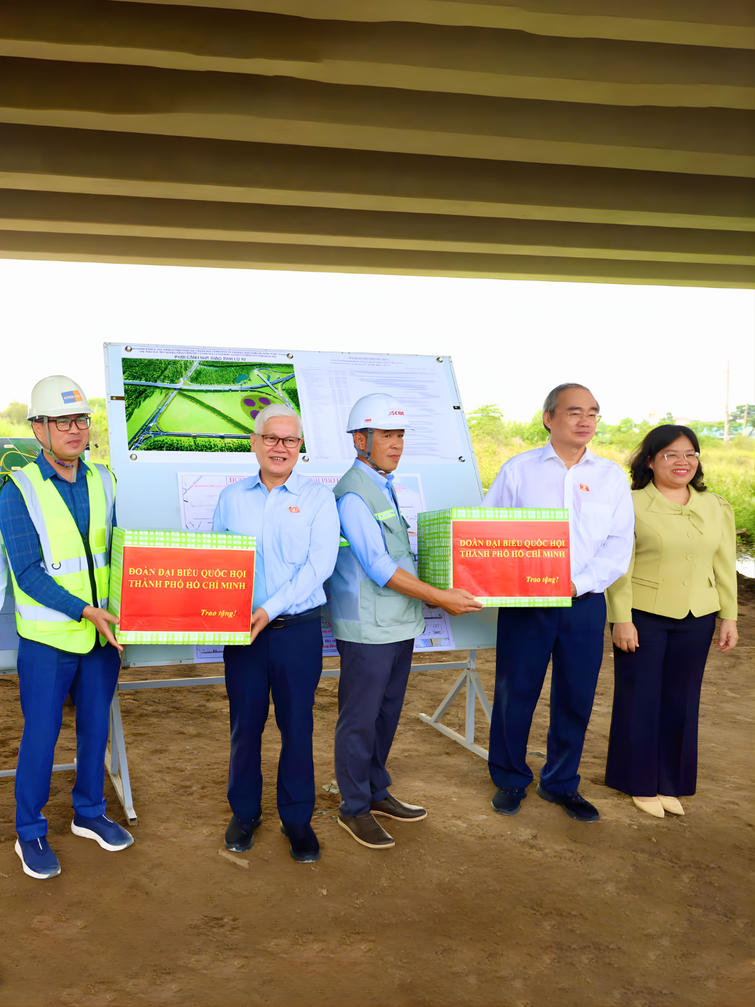 Đoàn đại biểu Quốc hội Thành phố trao quà cho nhà thầu thi công tại công trường.