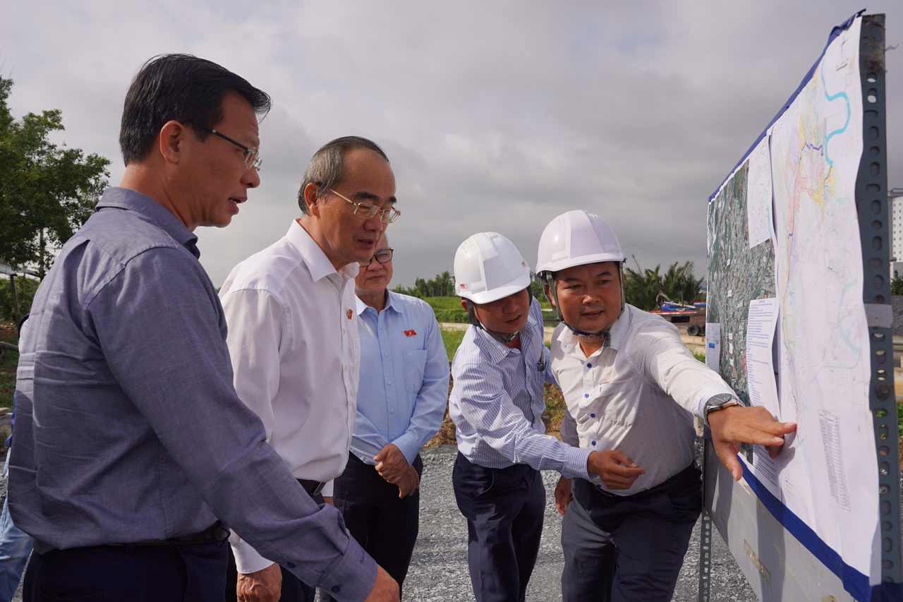 Đoàn đại biểu Quốc hội Thành phố Hồ Chí Minh nghe báo cáo tại công trình kênh Tham Lương - Bến Cát.