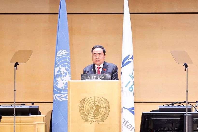 Chủ tịch Quốc hội Trần Thanh Mẫn phát biểu tại Phiên thảo luận chung của Hội nghị các Chủ tịch Quốc hội thế giới lần thứ 6, ngày 29/7/2025 tại Geneva, Thụy Sĩ. (Ảnh: TTXVN)