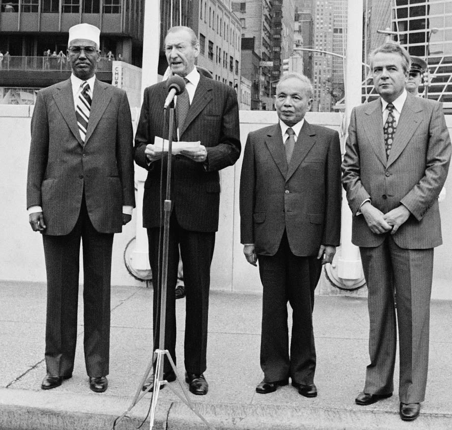 Ngày 20/9/1977, Việt Nam trở thành thành viên chính thức của Liên hợp quốc. Trong ảnh: Phó thủ tướng, Bộ trưởng Ngoại giao Nguyễn Duy Trinh (thứ hai, từ phải sang) dự lễ kéo cờ Việt Nam tại trụ sở Liên hợp quốc. (Ảnh: UN.ORG)