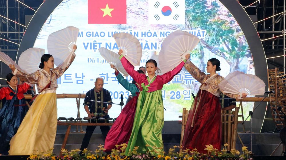 Các diễn viên Việt Nam trong trang phục truyền thống của Hàn Quốc trong Đêm giao lưu văn hóa nghệ thuật Việt Nam-Hàn Quốc năm 2023. (Ảnh: TTXVN)