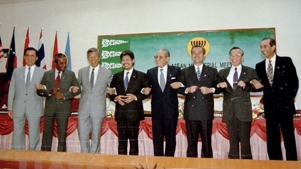 Bộ trưởng Ngoại giao Nguyễn Mạnh Cầm (thứ hai, từ phải sang), Tổng Thư ký ASEAN và các Bộ trưởng Ngoại giao ASEAN tại cuộc họp kết nạp Việt Nam trở thành thành viên chính thức thứ bảy của ASEAN, ngày 28/7/1995, tại thủ đô Bandar Seri Begawan (Brunei). (Ảnh: TTXVN)