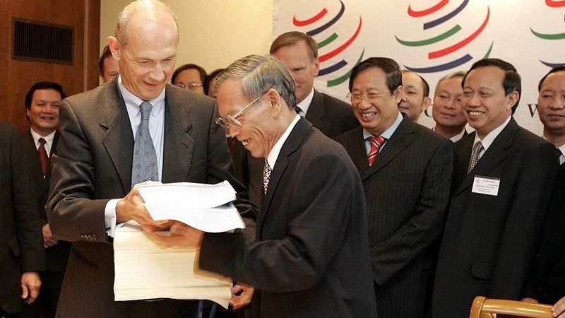 Ngày 7/11/2006, Bộ trưởng Thương mại Trương Đình Tuyển và Tổng giám đốc Tổ chức Thương mại thế giới (WTO) Pascal Lamy ký Nghị định thư gia nhập WTO của Việt Nam. (Ảnh: TTXVN)