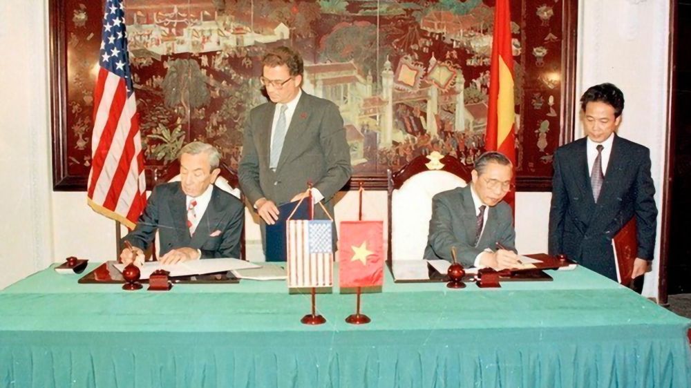 Ngày 5/8/1995, tại Hà Nội, Bộ trưởng Ngoại giao Nguyễn Mạnh Cầm và Bộ trưởng Ngoại giao Hoa Kỳ Warren Christopher ký Nghị định thư, chính thức thiết lập quan hệ ngoại giao Việt Nam-Hoa Kỳ. (Ảnh: TTXVN)