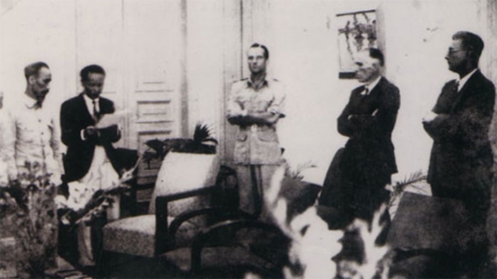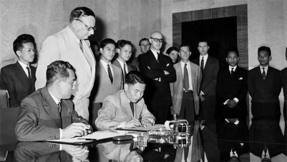Ngày 20/7/1954, Thứ trưởng Quốc phòng Tạ Quang Bửu (hàng ngồi thứ hai từ trái sang) thay mặt Chính phủ và Bộ Tổng tư lệnh Quân đội nhân dân Việt Nam ký Hiệp định đình chiến ở Việt Nam. Ngay sau đó, Hiệp định đình chiến ở Lào và Campuchia cũng được ký kết, tại Hội nghị Geneva (Thụy Sĩ). (Ảnh: TTXVN)