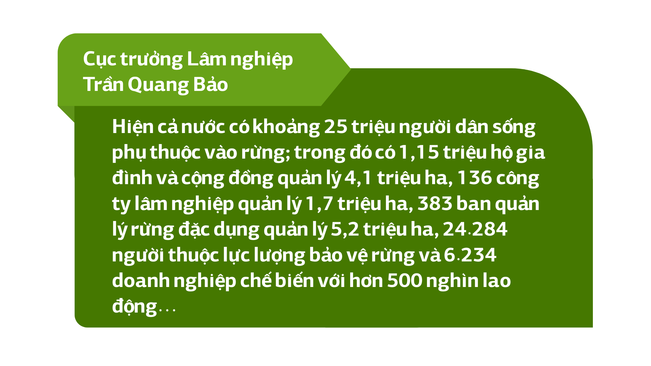 Cục trưởng Lâm nghiệp Trần Quang Bảo cho biết, hiện cả nước có khoảng 25 triệu người dân sống phụ thuộc vào rừng; trong đó có 1,15 triệu hộ gia đình và cộng đồng quản lý 4,1 triệu ha, 136 công ty lâm nghiệp quản lý 1,7 triệu ha, 383 ban quản lý rừng đặc dụng quản lý 5,2 triệu ha, 24.284 người thuộc lực lượng bảo vệ rừng và 6.234 doanh nghiệp chế biến với hơn 500 nghìn lao động…