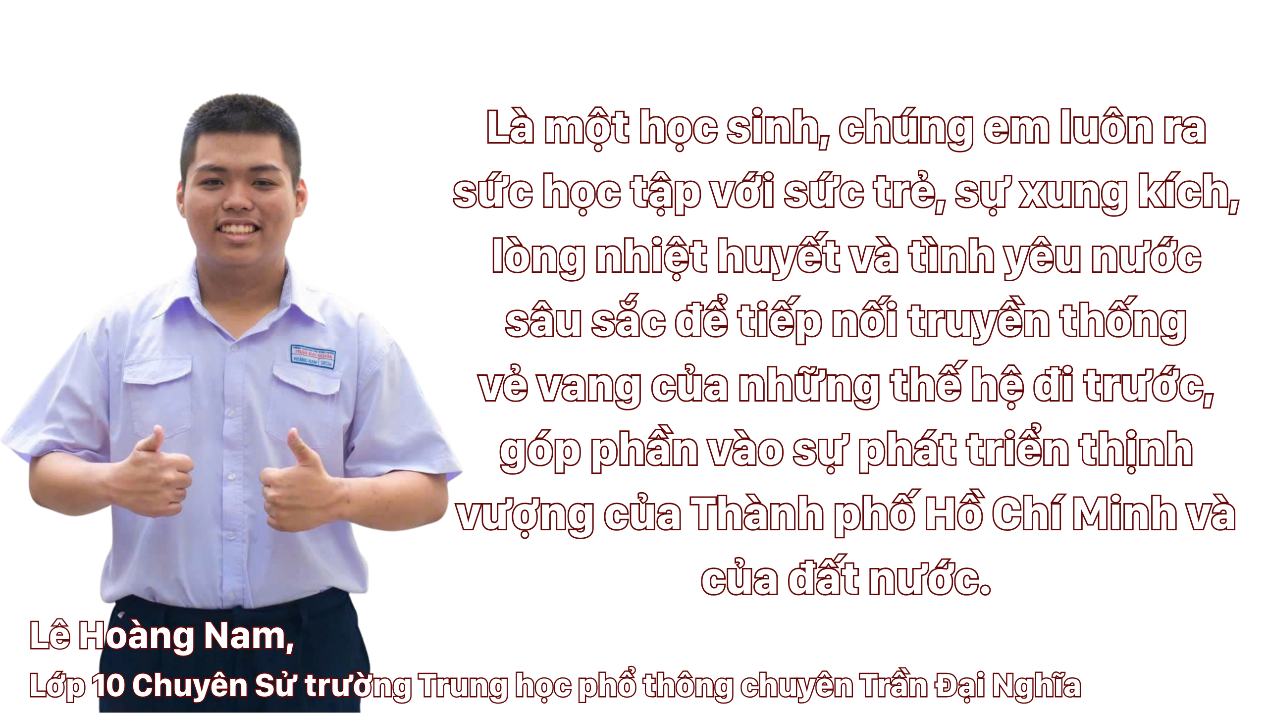 “Là một học sinh, chúng em luôn ra sức học tập với sức trẻ, sự xung kích, lòng nhiệt huyết và tình yêu nước sâu sắc để tiếp nối truyền thống vẻ vang của những thế hệ đi trước, góp phần vào sự phát triển thịnh vượng của Thành phố Hồ Chí Minh và của đất nước. Những hành động dù giản đơn như: tham quan bảo tàng nhằm tìm hiểu về lịch sử hay tham gia các chuyên đề sinh hoạt dưới cờ, các hoạt động ngoại khóa, tham gia hoạt động câu lạc bộ văn hóa Việt Nam… chúng em muốn được học hỏi trau dồi thêm kiến thức đồng thời qua đó tuyên truyền đến mọi người về những giá trị tốt đẹp của dân tộc ta”, Nam chia sẻ.