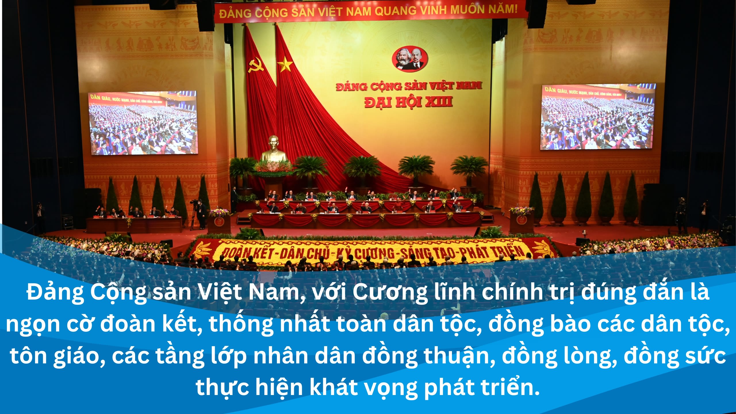 Đảng Cộng sản Việt Nam, với Cương lĩnh chính trị đúng đắn là ngọn cờ đoàn kết, thống nhất toàn dân tộc, đồng bào các dân tộc, tôn giáo, các tầng lớp nhân dân đồng thuận, đồng lòng, đồng sức thực hiện khát vọng phát triển. Trong đó, vai trò, năng lực lãnh đạo, cầm quyền, sức chiến đấu của Đảng là trụ cột của sự tác động, chuyển hóa giữa phát triển và ổn định.