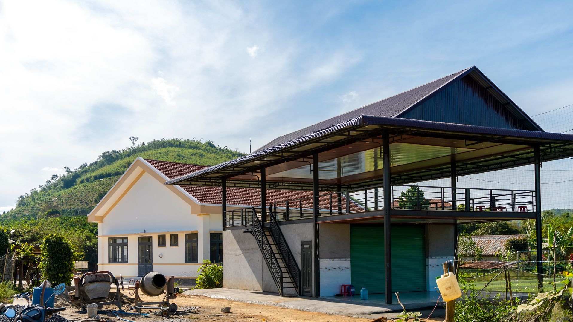 Sân trường lầy lội bùn non của điểm trường nay đã được đổ bê-tông, rộn ràng những trò chơi tuổi thơ như nhảy dây, đuổi bắt… Phía sau là dãy lớp học được kiên cố hóa, lợp tôn khang trang, dưới lá cờ Tổ quốc tung bay kiêu hãnh. Và sau cùng là một trong những hạng mục đầu tiên của ngôi trường mới - nhà công vụ - đã hoàn thành, trở thành nơi ăn, chốn ở ổn định cho các thầy cô giáo công tác tại điểm trường.