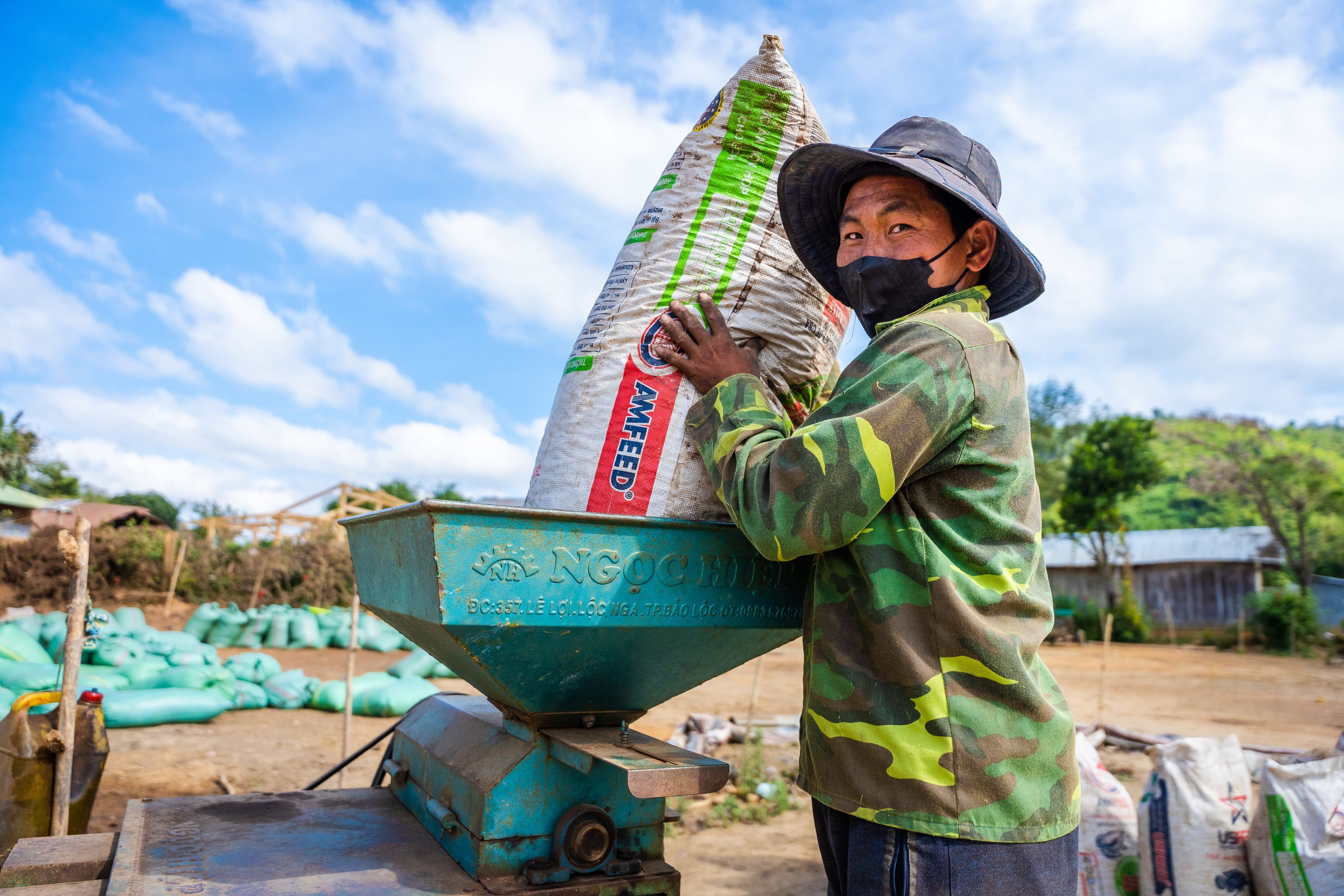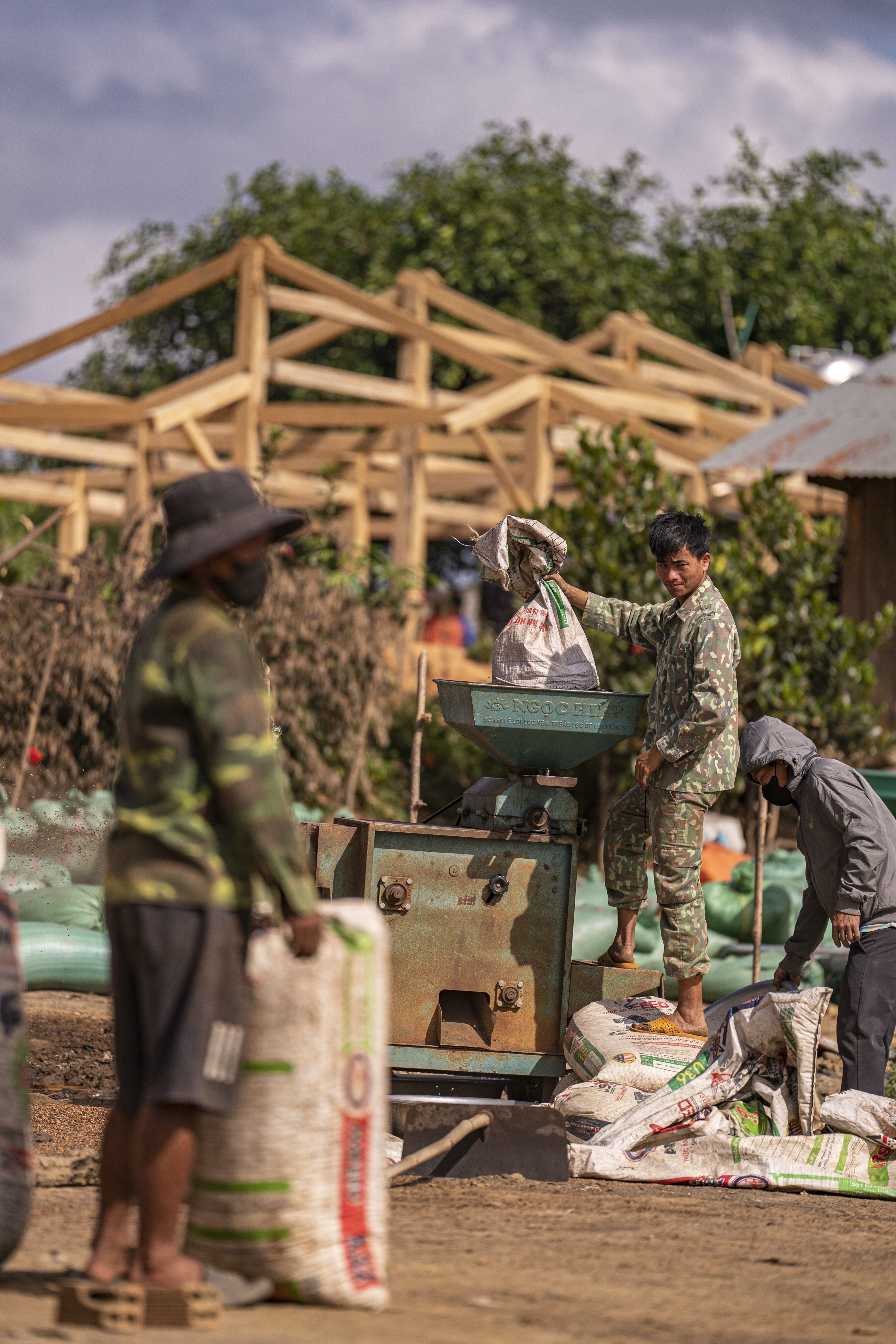 A Tủa với chiếc cào trong tay nhẹ nhàng giàn đều “chiến lợi phẩm” của nhà mình, trong khi anh Sính thì liên tục đổ những bao cà-phê xuống.