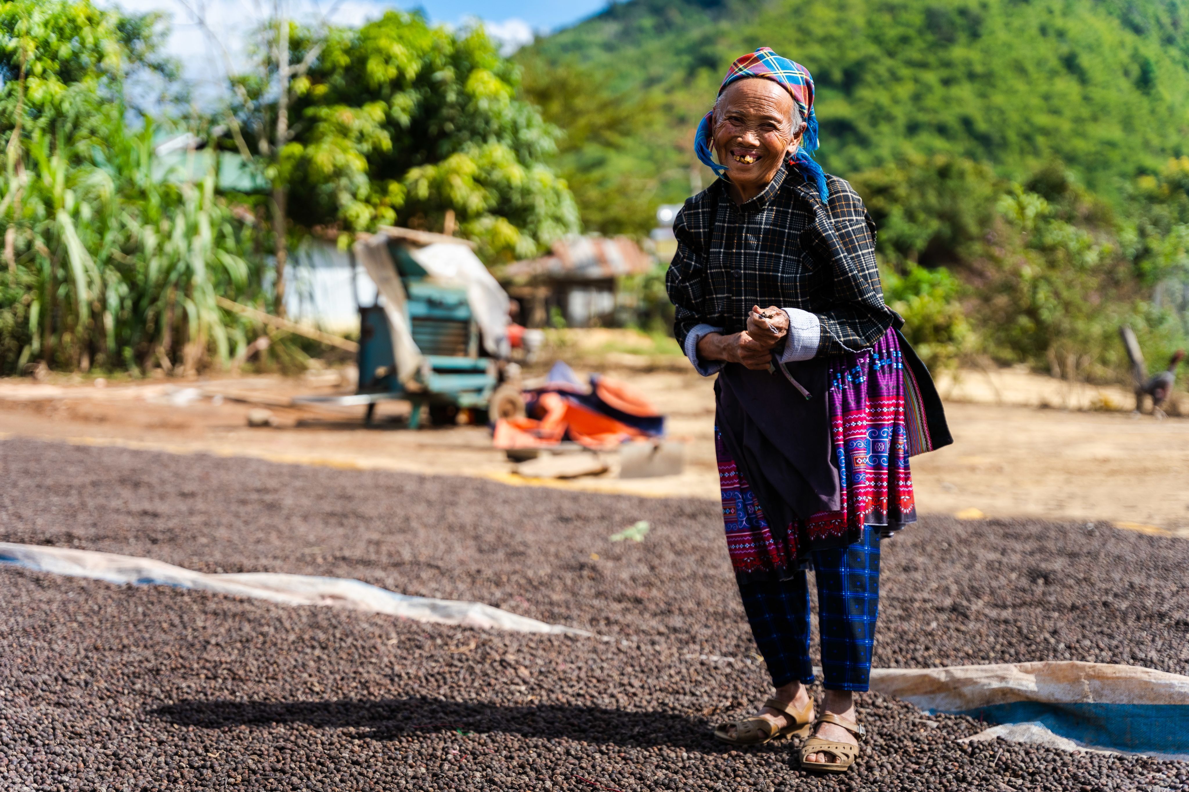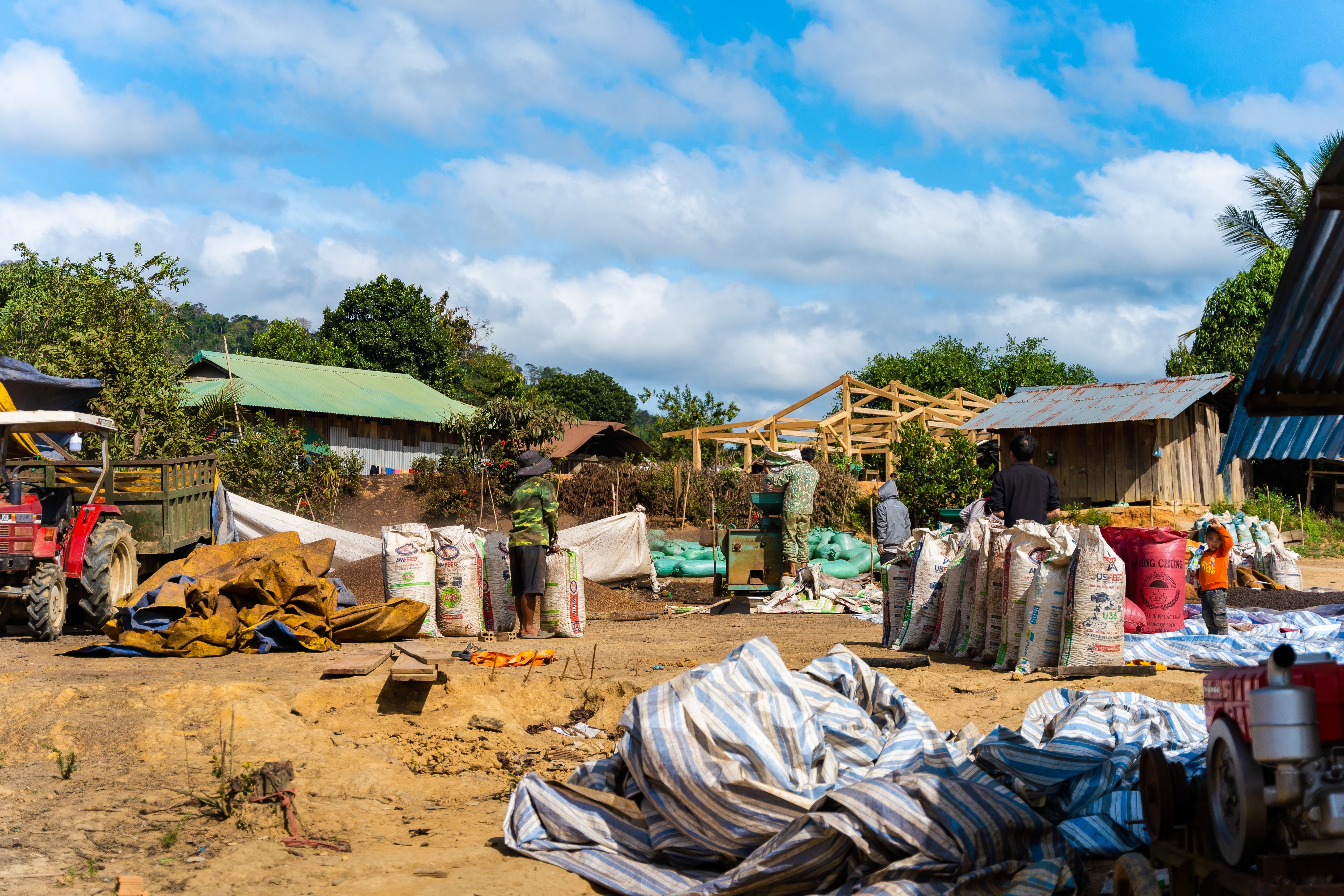 Những bao cà-phê như những chú lợn con được người Mông bế ẵm từ rẫy, tập kết ở sân phơi - một khoảnh đất rộng chừng 4-5.000 mét vuông, ở vị trí cao nhất trong làng. Những hạt cà-phê với nhiều sắc thái: từ xanh, vàng, đỏ tới màu hổ phách được rải ngay ngắn trên những tấm bạt khổ lớn, chờ đợi đủ nắng để thương lái thu mua.