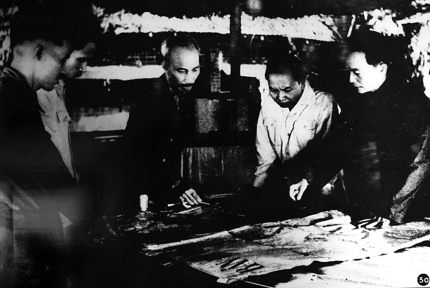 Chủ tịch Hồ Chí Minh và các đồng chí trong Ban Thường vụ Trung ương Đảng họp quyết định mở Chiến cuộc Đông Xuân 1953-1954 và Chiến dịch Điện Biên Phủ (xã Phú Đình, huyện Định Hóa, tỉnh Thái Nguyên cuối năm 1953.