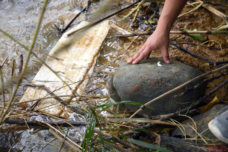 Tảng đá nằm nửa chìm, nửa nổi giữa dòng nước đục ngầu. Đây là nơi cách đây hơn 50 năm, ông Trinh dùng để giấu thư liên lạc của cả tổ. (Ảnh: THÀNH ĐẠT)