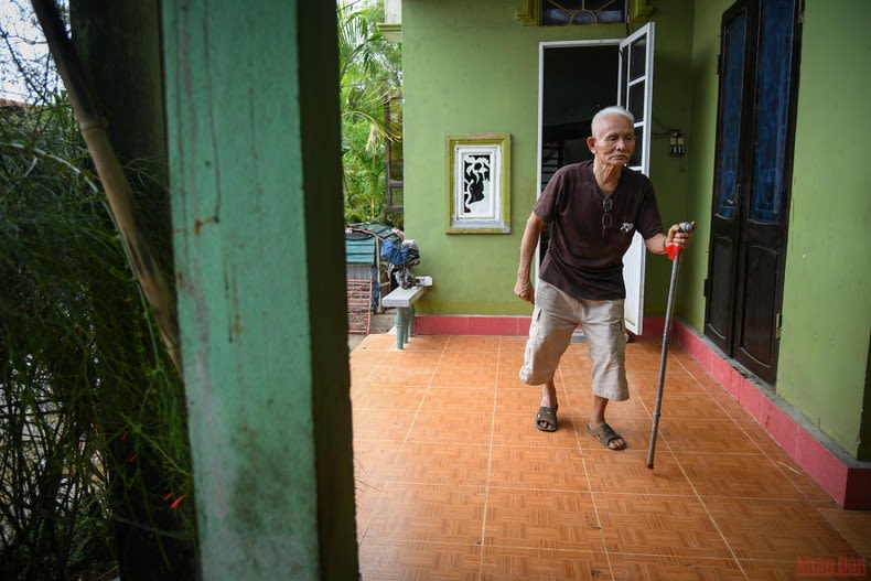 Dù lọc cọc chống gậy nhưng ông Trinh hào hứng đưa chúng tôi ra sát bờ sông xem nơi giấu những bức thư liên lạc. (Ảnh: THÀNH ĐẠT)