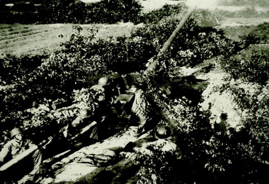Trận địa pháo nòng dài 100mm của Tiểu đoàn 1, Trung đoàn Pháo binh 167 nã đạn mãnh liệt vào căn cứ Dốc Miếu lúc 18 giờ 18 phút ngày 20/3/1967. Nguồn: Bộ Quốc phòng