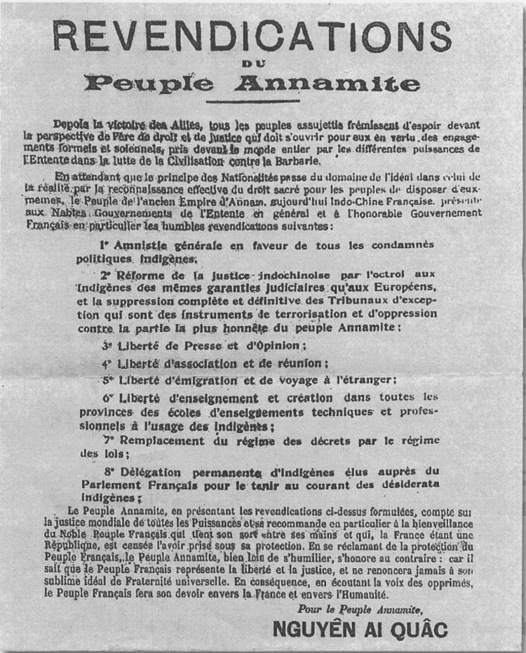 Меморандум с требованием из восьми пунктов вьетнамского народа, направленный Нгуен Ай Куоком и группой вьетнамских патриотов французскому парламенту и делегациям, участвовавшим в Версальской конференции. Фото: ВИА