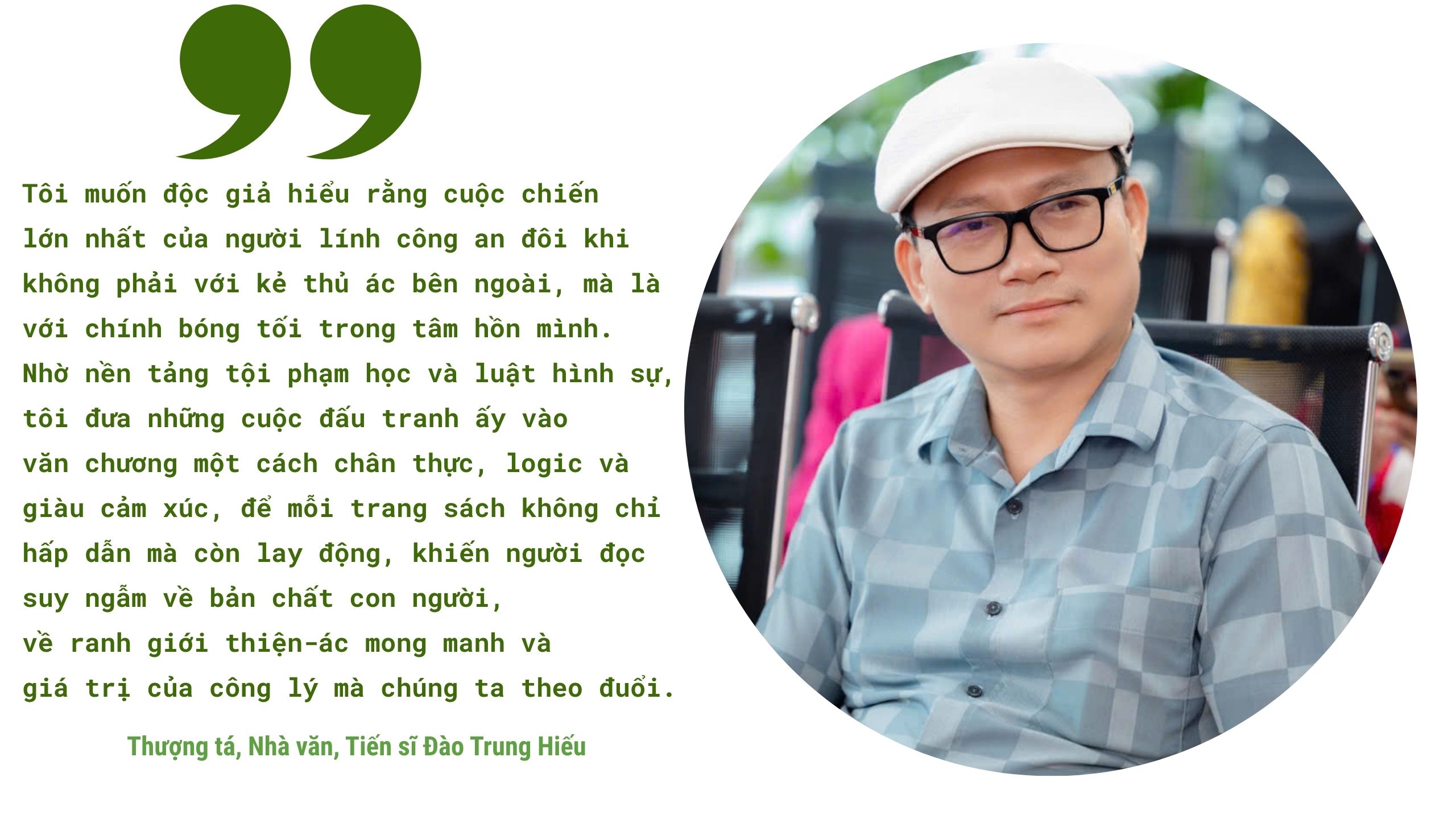 Phóng viên: Thưa Thượng tá, Nhà văn, Tiến sĩ Đào Trung Hiếu, từ một sĩ quan cảnh sát hình sự Hà Nội, anh đã dấn thân vào con đường sáng tác văn học với những tác phẩm hình sự - điều tra đầy ám ảnh. Cơ duyên nào khiến anh chọn văn chương như một vũ khí khác để tiếp tục cuộc chiến chống tội phạm?