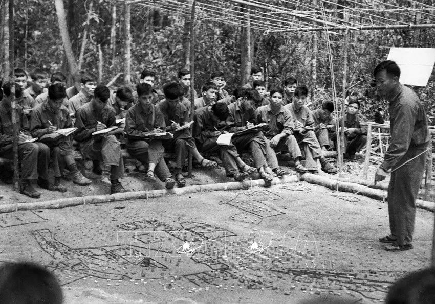 Các chiến sĩ đoàn Pleime (Gia Lai) thảo luận phương án đánh địch. (Ảnh: TTXVN)