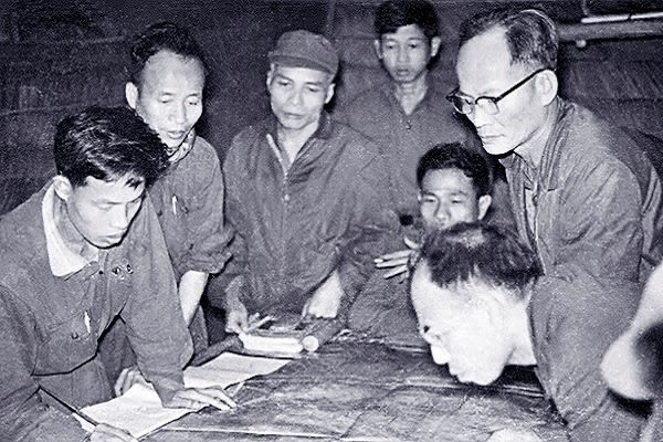 Bộ chỉ huy chiến dịch Bắc Tây Nguyên họp bàn kế hoạch tác chiến. Đồng chí Hoàng Minh Thảo (ngoài cùng bên phải) Ảnh tư liệu