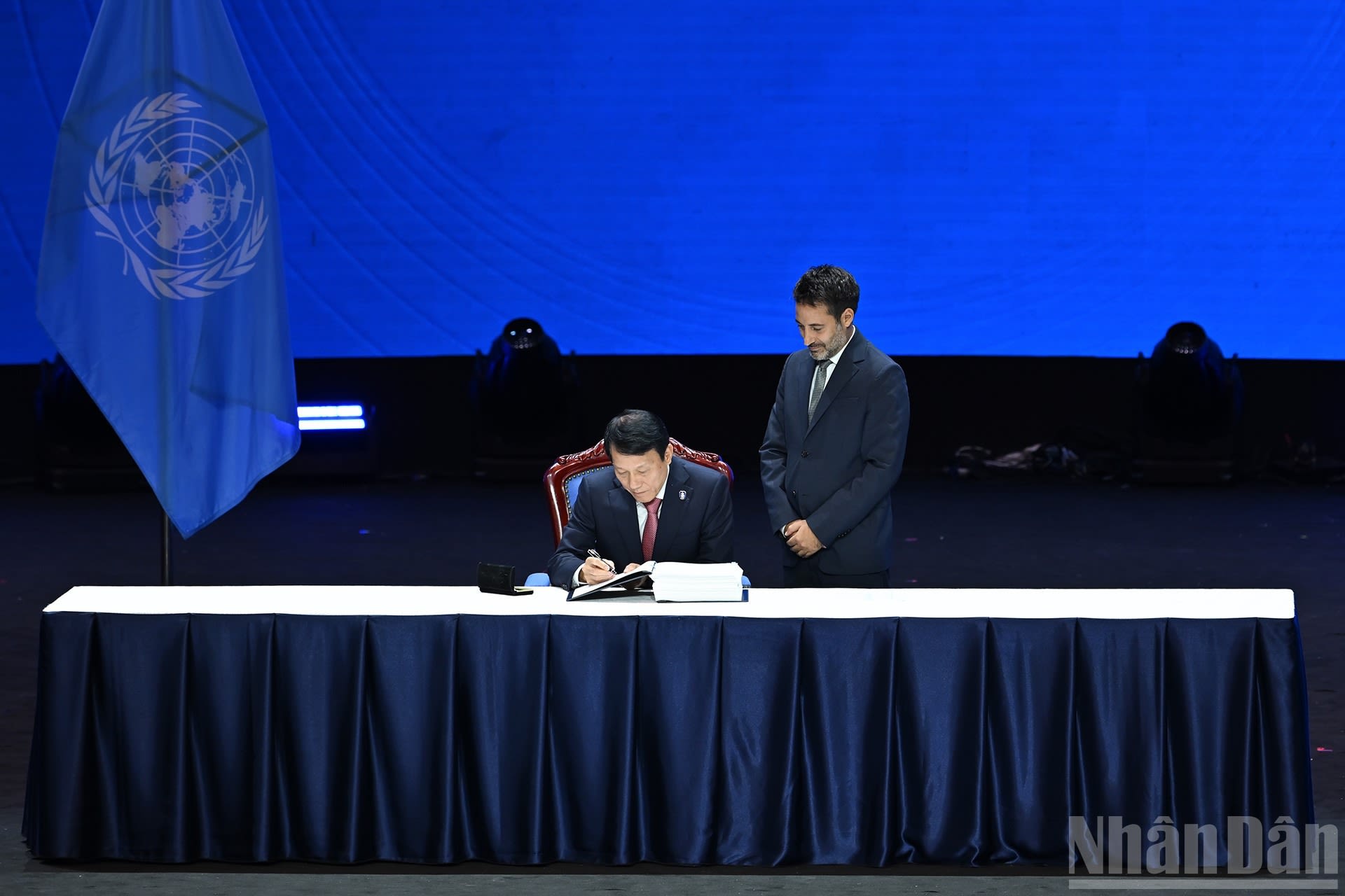 Bộ trưởng Công an Việt Nam Lương Tam Quang ký Công ước của Liên hợp quốc về chống tội phạm mạng. (Ảnh: Thủy Nguyên)
