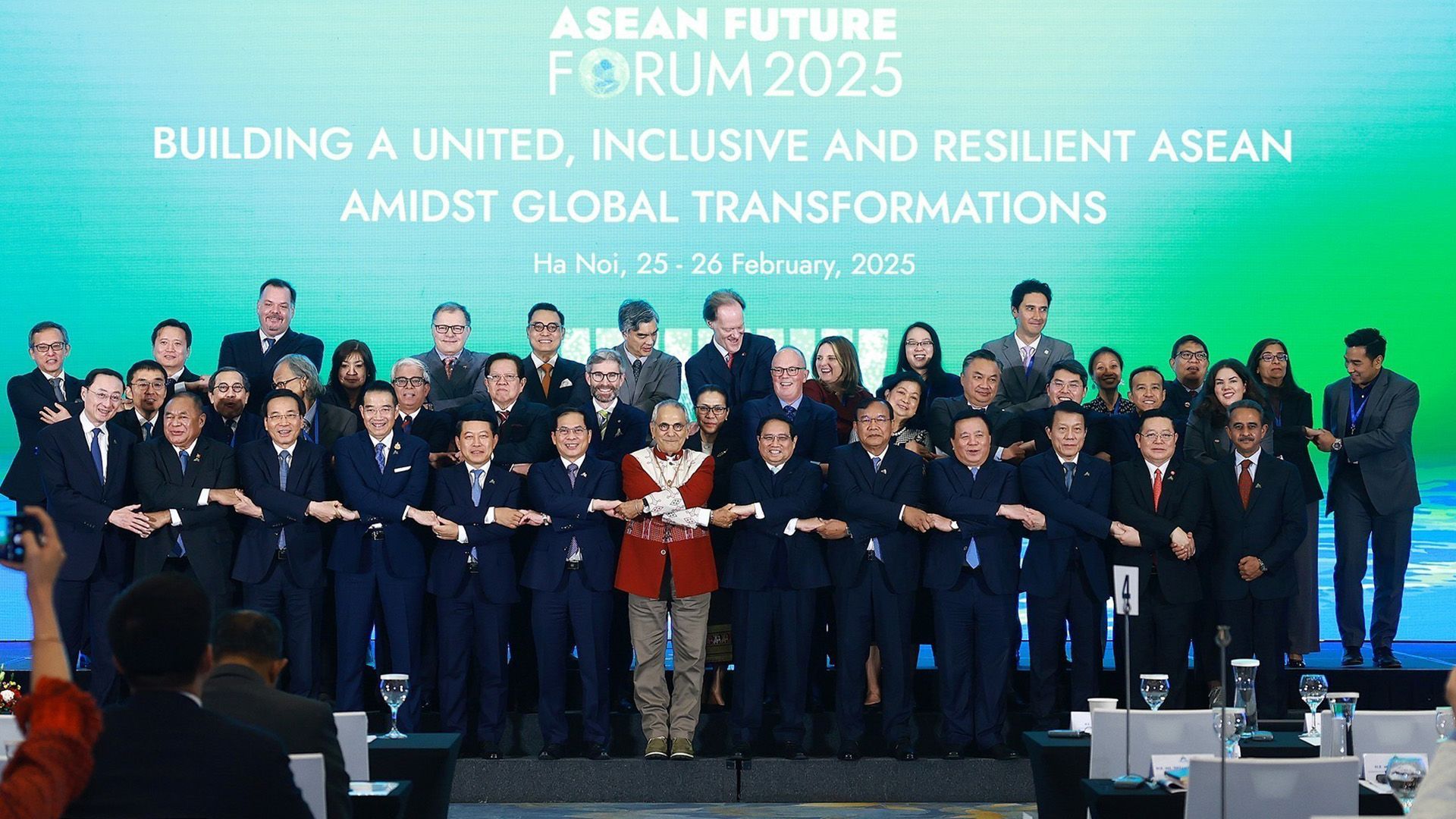 越南政府总理范明正与出席2025年东盟未来论坛的各代表团团长合影。(图片来源:越通社)