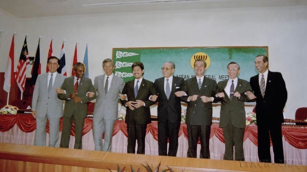 1995年7月28日,在文莱首都斯里巴加湾,越南外交部长阮孟琴(右二)、东盟秘书长及东盟各国外长出席宣布越南正式成为东盟第七个成员国的会议。(图片来源:越通社)