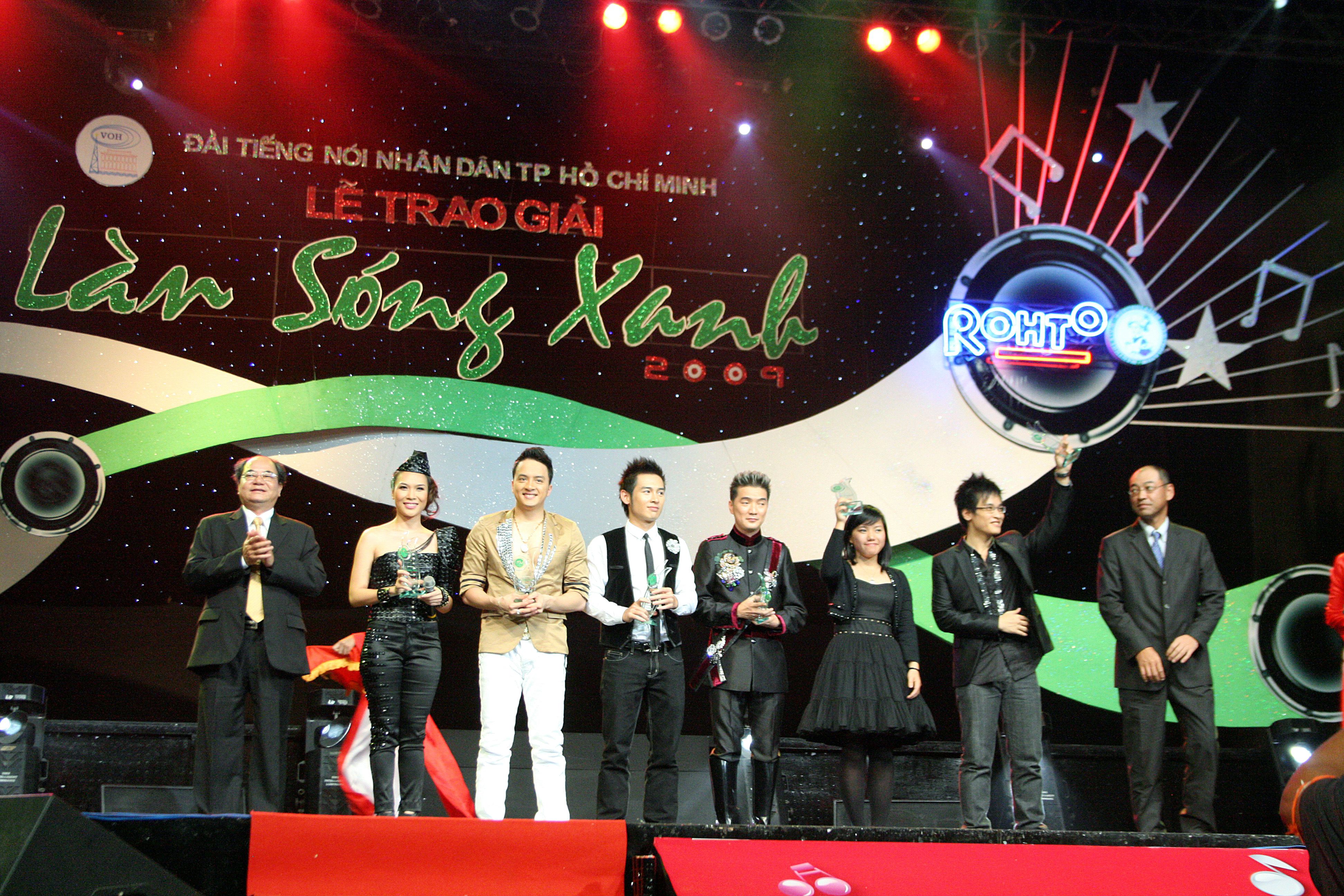 Chương trình ca nhạc Top ten Làn Sóng Xanh góp phần tôn vinh nhạc Việt và nâng cao đời sống văn hóa tinh thần của thanh thiếu niên thành phố. Ảnh: Lãnh đạo Đài Tiếng nói nhân dân Thành phố Hồ Chí Minh trao biểu trưng của chương trình Làn sóng xanh cho các ca sĩ được bình chọn năm 2009