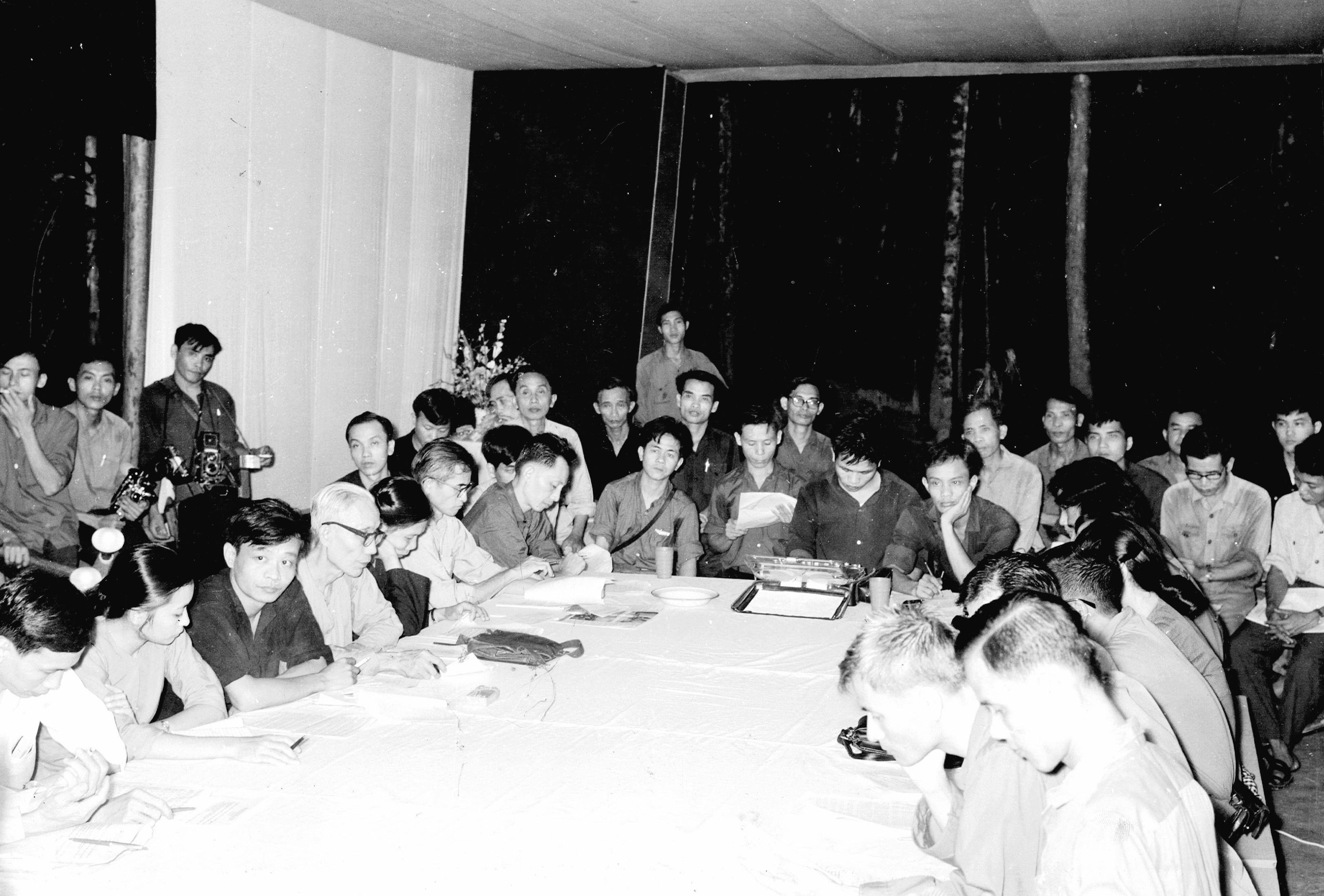 Trong khói lửa chiến tranh, đội ngũ cán bộ, biên tập, kỹ thuật của đài luôn đưa tin, bình luận kịp thời, góp phần cổ vũ quân dân cả nước đứng lên làm nên đại thắng mùa Xuân 1975 thu non sông về một mối, Nam Bắc sum họp một nhà. Ảnh: Cán bộ kỹ thuật phòng Bá âm - Đài Phát thanh Giải Phóng đang thu lưu động tại một Hội nghị của Trung ương Cục miền Nam ở chiến khu.