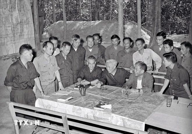 Bộ Chỉ huy Chiến dịch Hồ Chí Minh tại căn cứ Tà Thiết-Lộc Ninh, trong đó Trung tướng Lê Đức Anh là Phó Tư lệnh cùng với các đồng chí Thượng tướng Trần Văn Trà, Trung tướng Đinh Đức Thiện và Trung tướng Lê Trọng Tấn. Trong Chiến dịch này, Trung tướng Lê Đức Anh chỉ huy cánh quân tiến công trên hướng Tây - Tây Nam Sài Gòn (đoàn 232), một trong năm cánh quân của trận quyết chiến chiến lược cuối cùng. (Ảnh: TTXVN)