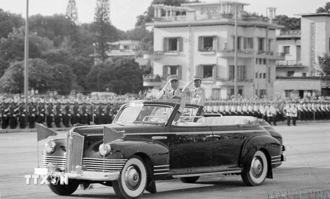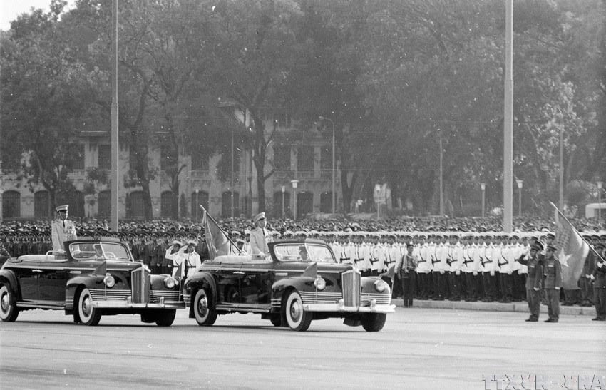 Trung tướng Lê Đức Anh ( trên xe bên trái) cùng Đại tướng Võ Nguyên Giáp duyệt binh ngày 2 tháng 9 năm 1975. Ảnh: Thư viện Đại tướng Lê Đức Anh