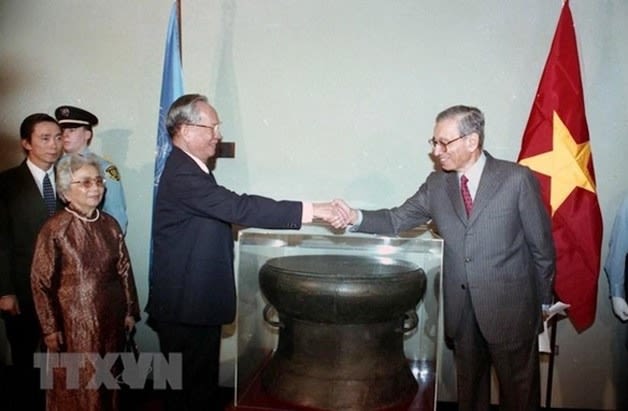 Nhân dịp tham dự Lễ kỷ niệm 50 năm Ngày thành lập Liên hiệp quốc (1945-1995), chiều 25/10/1995, tại Trụ sở Liên hiệp quốc ở New York (Hoa Kỳ), Chủ tịch nước Lê Đức Anh trao tặng phiên bản trống đồng Ngọc Lũ cho Tổng thư ký Liên hiệp quốc Boutros B. Ghali. (Nguồn: TTXVN)