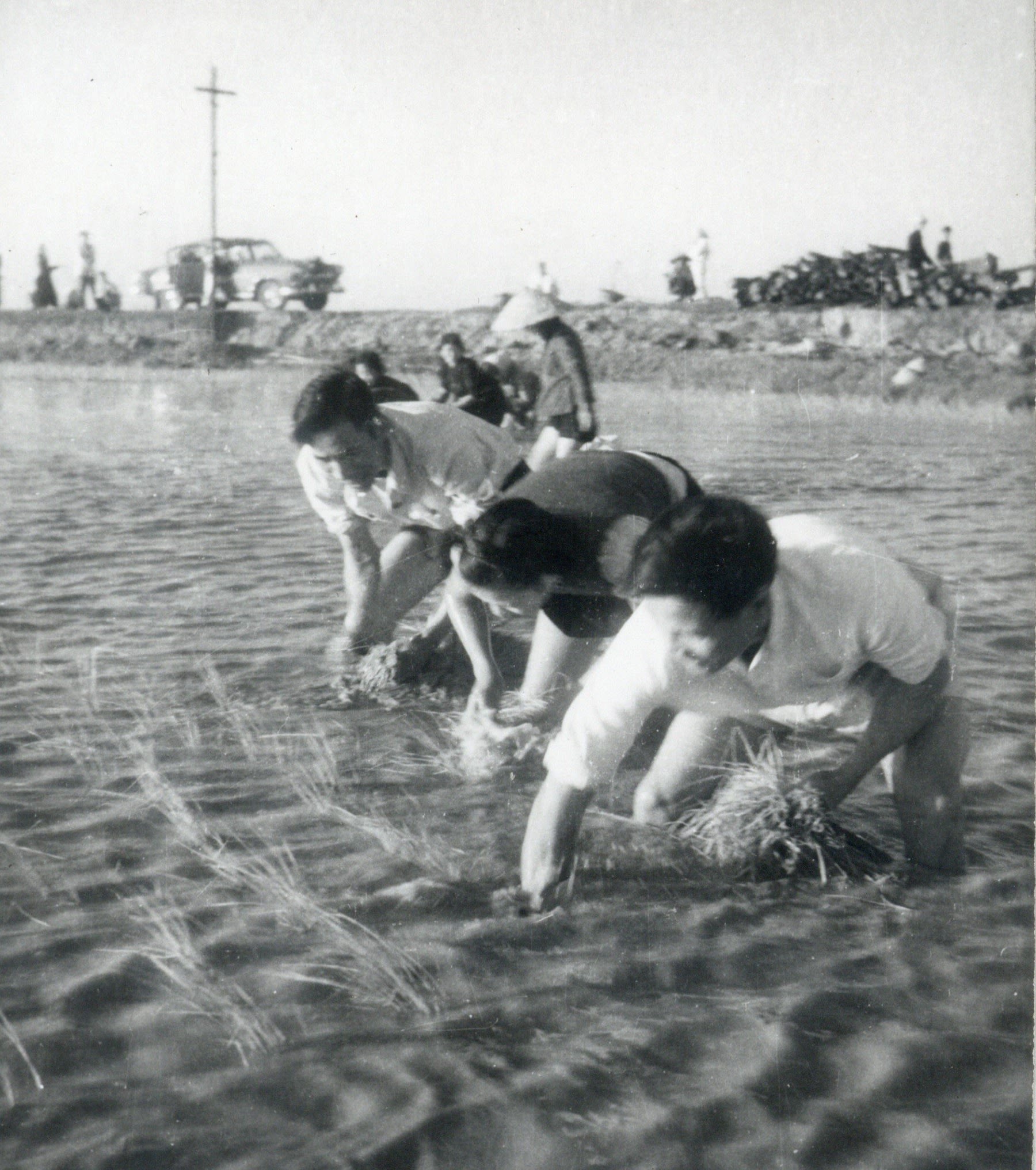 Đại tướng Nguyễn Chí Thanh, Trưởng ban Công tác nông thôn Trung ương (ngoài cùng bên phải) cấy lúa cùng bà con xã viên Hợp tác xã Chiến Thắng, xã Lý Ninh, huyện Đồng Hới, tỉnh Quảng Bình, tháng 1/1962. Ảnh tư liệu