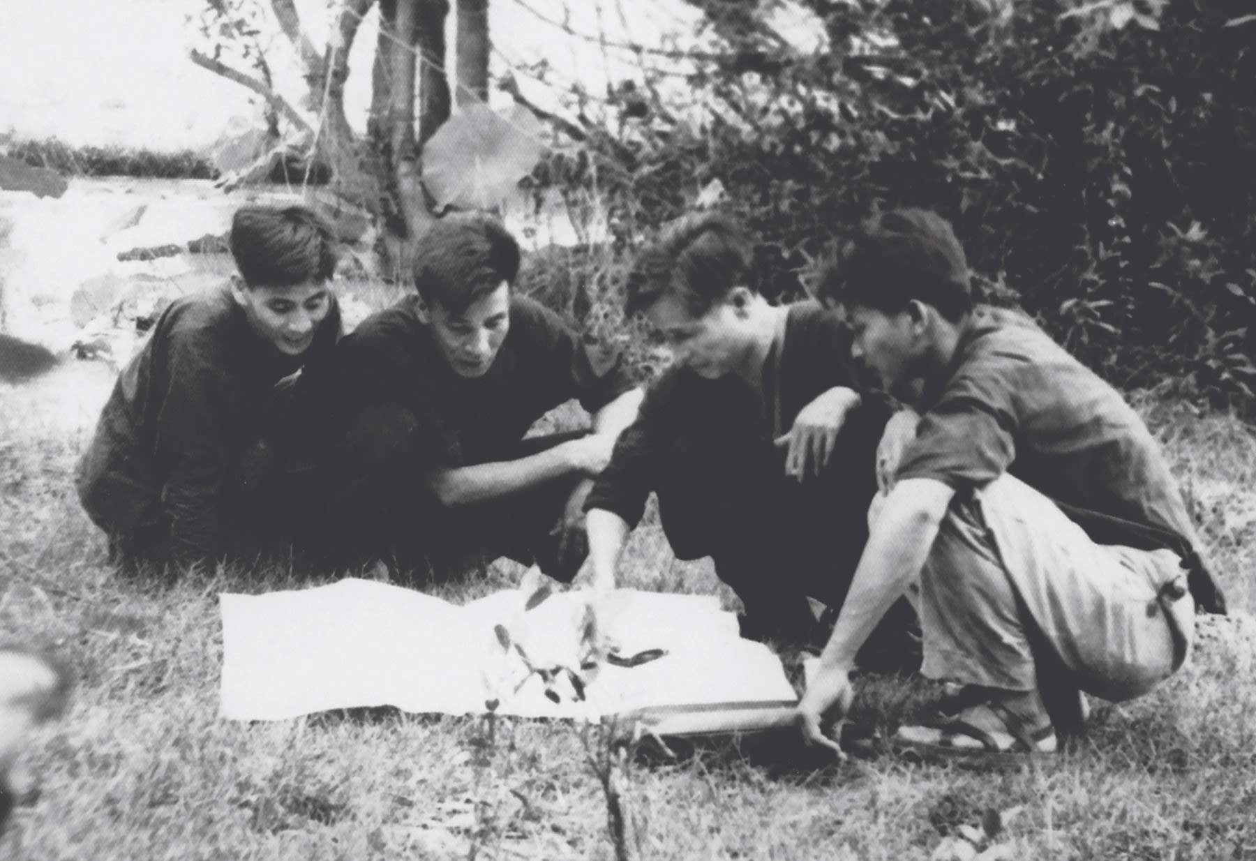 Đại tướng Nguyễn Chí Thanh, Ủy viên Bộ Chính trị, Bí thư Trung ương Cục miền Nam, Chính ủy quân giải phóng miền Nam cùng các đồng chí đang nghiên cứu bản đồ tác chiến tại Trảng Lớn, khu vực Kà Tum, 1964. Ảnh tư liệu