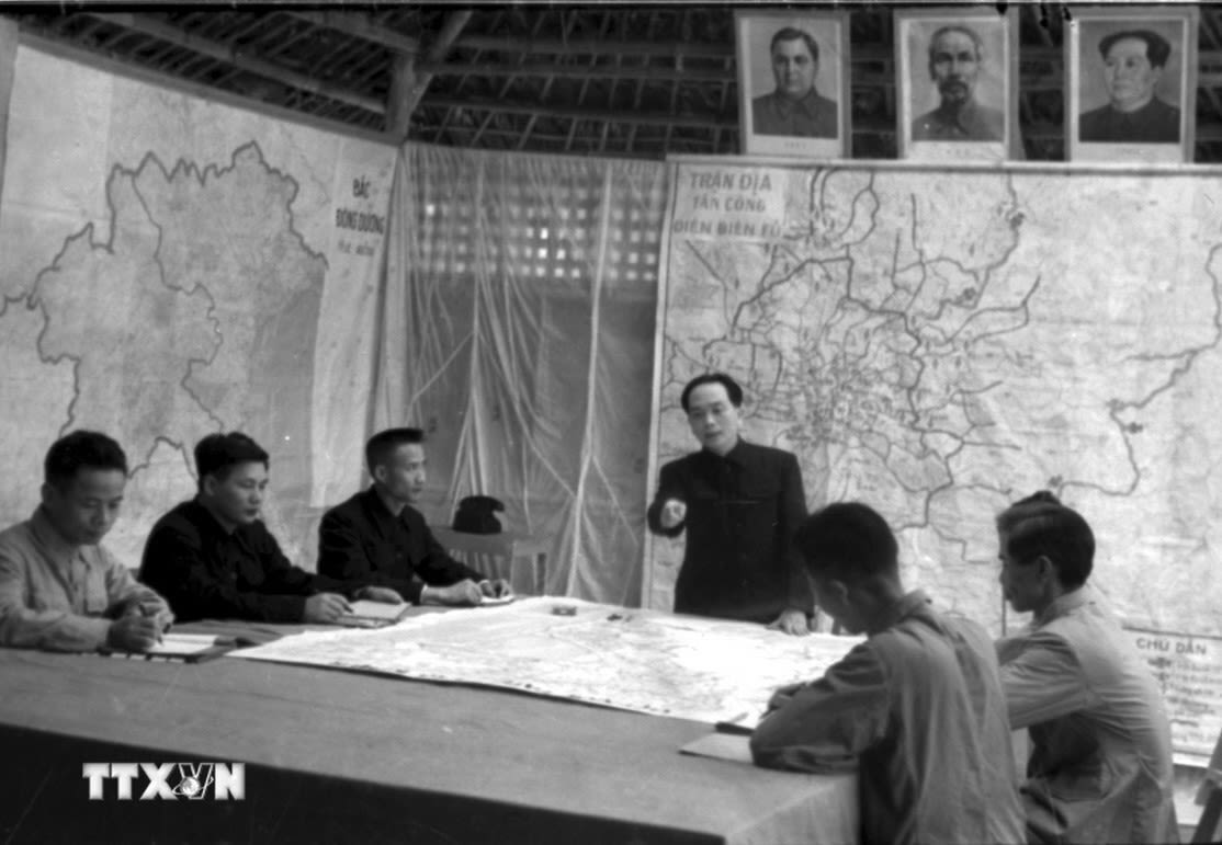 Đại tướng Võ Nguyên Giáp và Bộ Tổng tham mưu Quân đội nhân dân Việt Nam nghiên cứu kế hoạch tác chiến Chiến dịch Điện Biên Phủ.