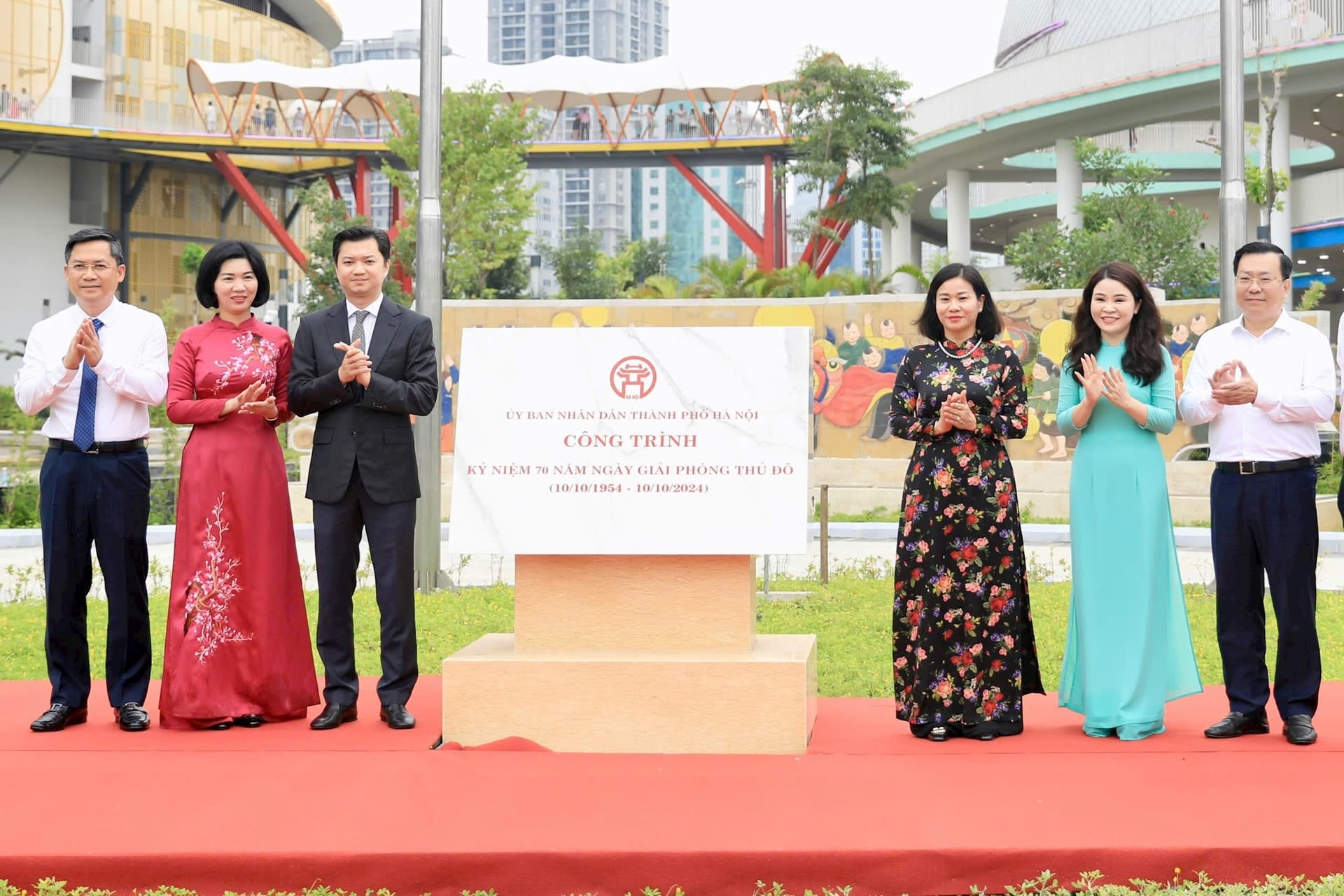 Phó Bí thư Thường trực Thành ủy Hà Nội Nguyễn Thị Tuyến gắn biển công trình 70 năm Ngày giải phóng Thủ đô cho Cung thiếu nhi Hà Nội.