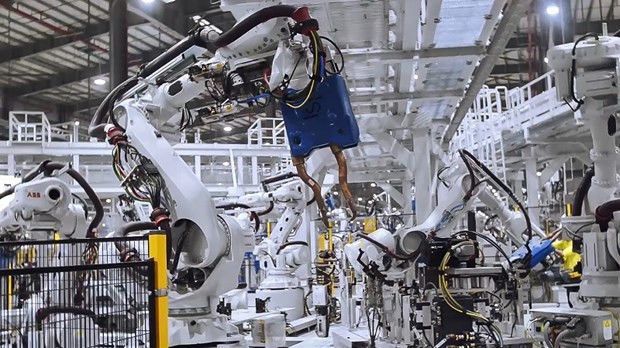 Robot hàn đang làm việc trong xưởng hàn thân xe tại Tổ hợp sản xuất ôtô VinFast.