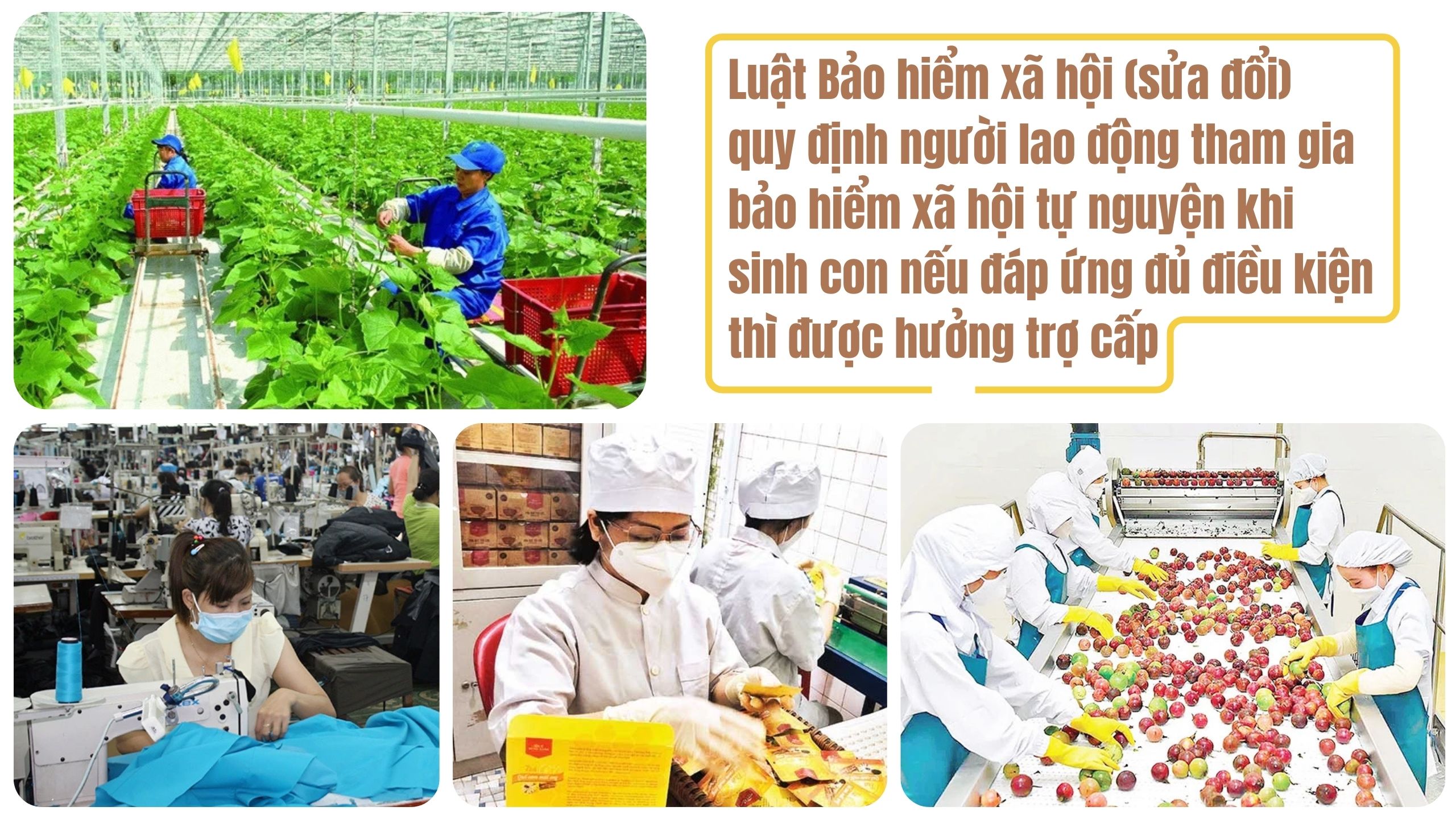 Do đó, Luật Bảo hiểm xã hội (sửa đổi) quy định người lao động tham gia bảo hiểm xã hội tự nguyện (bao gồm cả lao động nữ và lao động nam) khi sinh con nếu đáp ứng đủ điều kiện (đóng bảo hiểm xã hội từ đủ 6 tháng trở lên trong thời gian 12 tháng trước khi sinh con) thì được hưởng trợ cấp bằng 2 triệu đồng cho mỗi con được sinh ra và mỗi thai từ 22 tuần tuổi trở lên chết trong tử cung, thai chết trong khi chuyển dạ.