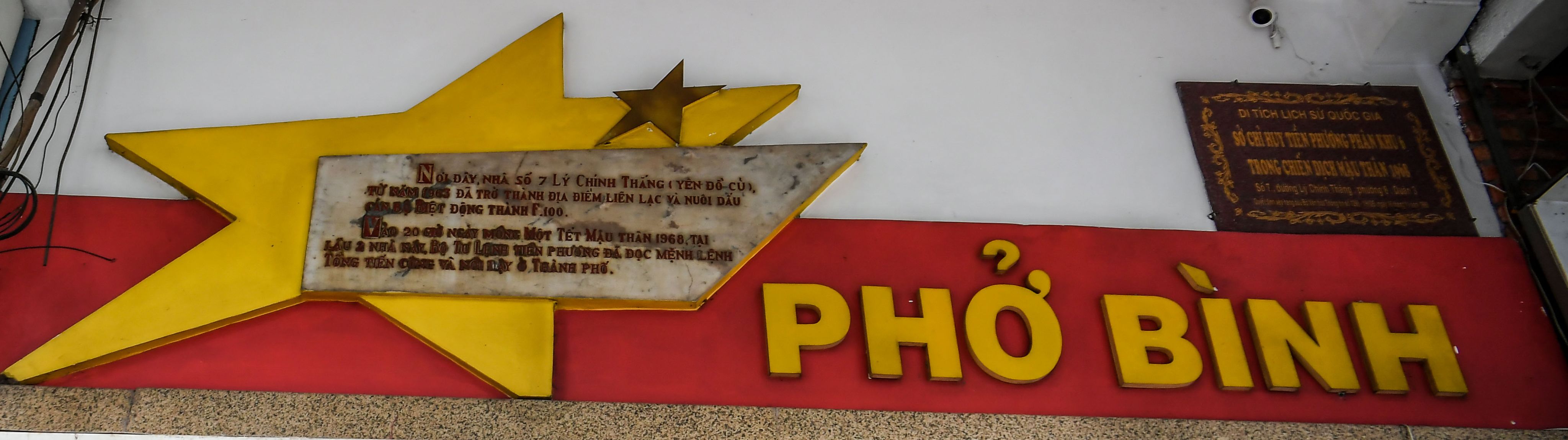 Nằm trên con phố luôn tấp nập người qua lại, quán phở Bình không gây chú ý bởi phong cách trang trí mới lại, hay sang trọng, mà bởi tấm biển có một không hai ngay trên mặt tiền. Tấm biển được làm bằng xi-măng, với hai màu đỏ-vàng chủ đạo, ngoài tên quán là Phở Bình, biển gắn hình ngôi sao 5 cánh cùng lời chú thích: "Nơi đây, nhà số 7 Lý Chính Thắng (Yên Đổ cũ), từ năm 1963 đã trở thành địa điểm liên lạc và nuôi dấu cán bộ Biệt động Thành F100. Vào 20 giờ ngày mồng một Tết Mậu Thân 1968, tại lầu 2 nhà này, Bộ Tư lệnh tiền phương đã đọc mệnh lệnh Tổng tiến công và nổi dậy ở Thành phố".