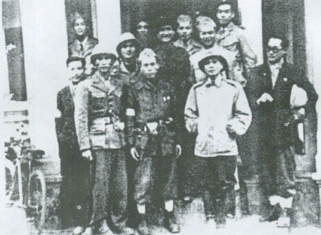 Giáo sư Trần Hữu Tước, Đại tướng Võ Nguyên Giáp (hàng thứ nhất, từ phải sang) cùng một số cán bộ, chiến sĩ Trung đoàn Thủ Đô cuối tháng 2/1947. (Ảnh tư liệu/Báo Quân đội nhân dân)
