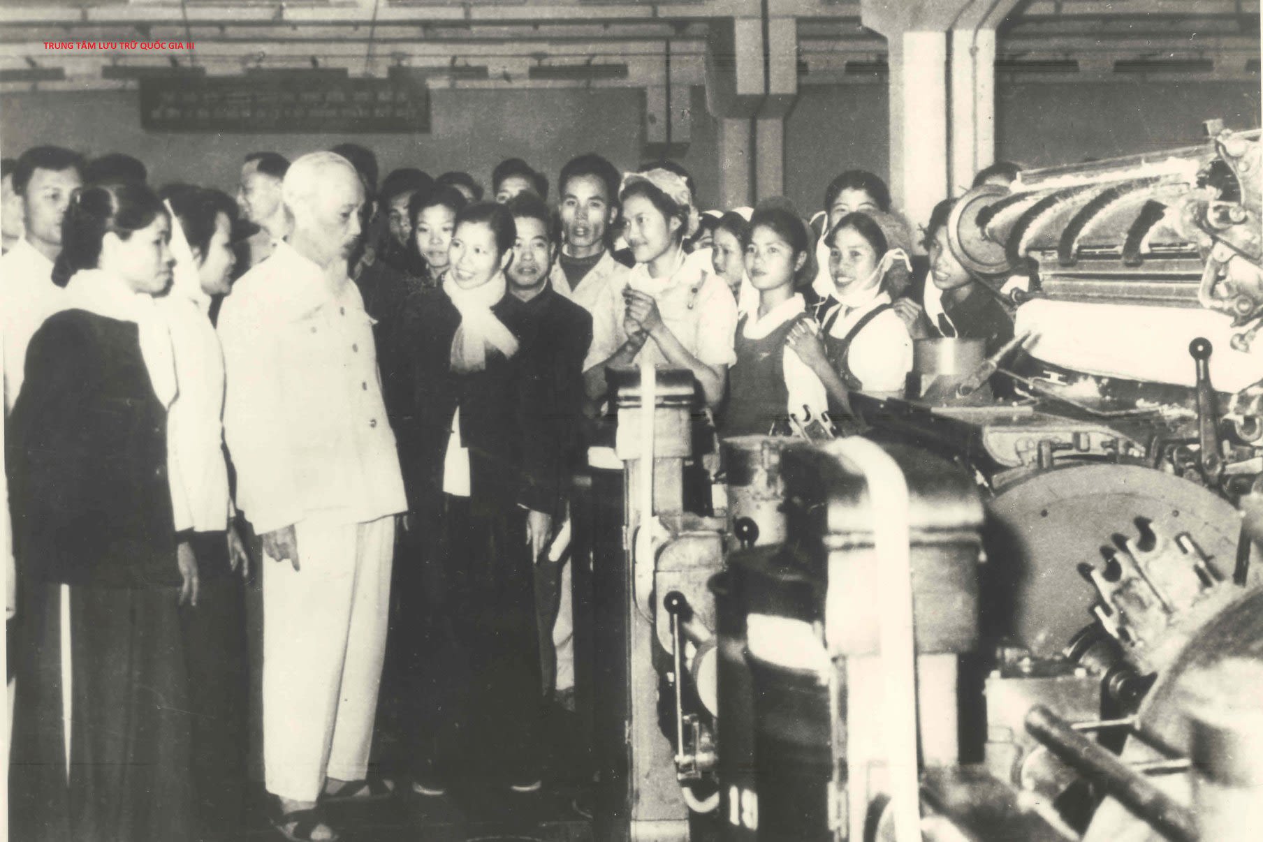 胡志明主席值三八国际妇女节之际于1965年3月8日造访河内三八纺织厂。(图片来源:国家文书档案局三号国家档案中心)